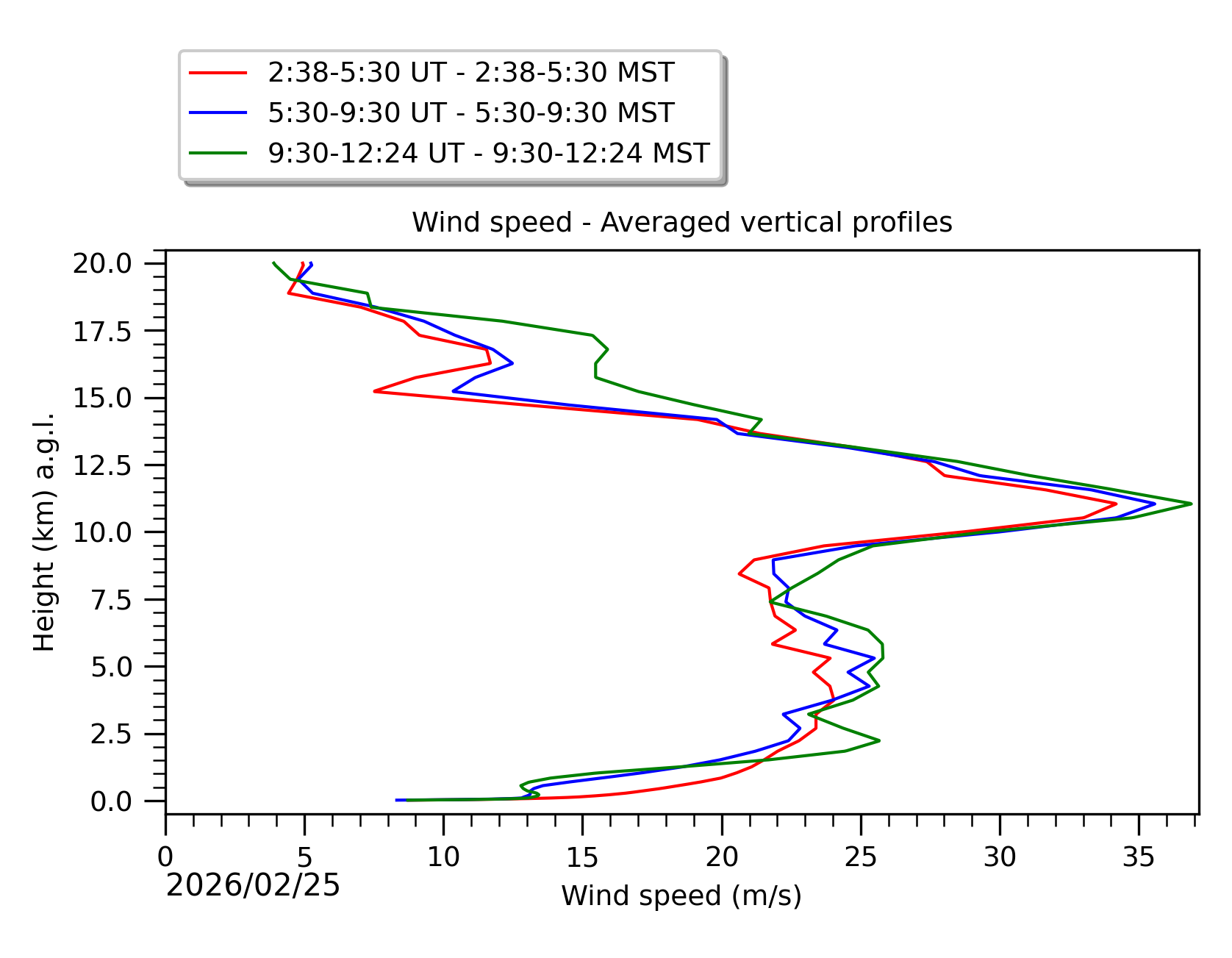 Fig. 8: Averaged wind speed in the three successive periods of the night (see red, blue and green intervals). |