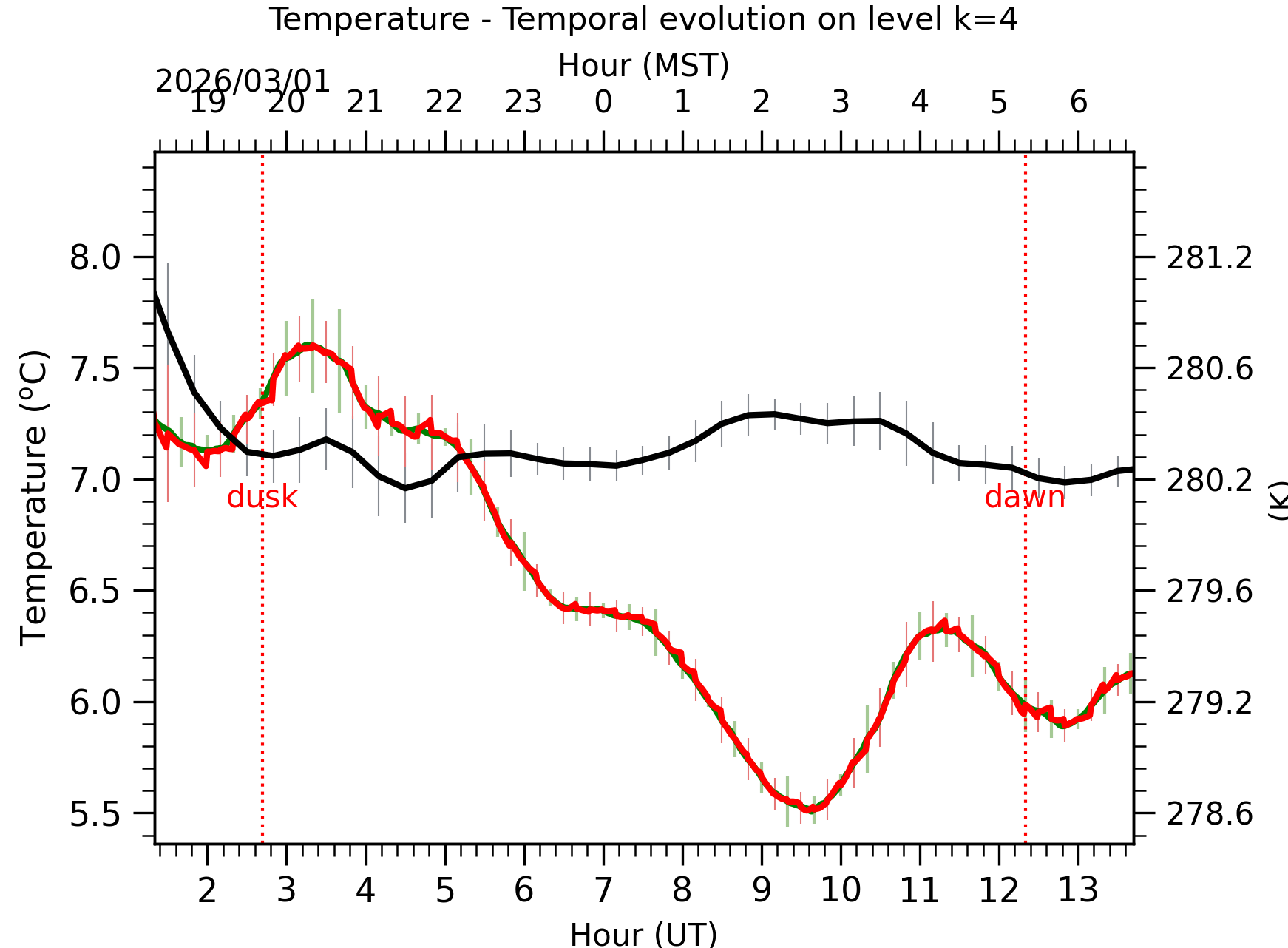 Fig. 4: Absolute temperature temporal evolution between the sunset and the sunrise at [38-62]m.