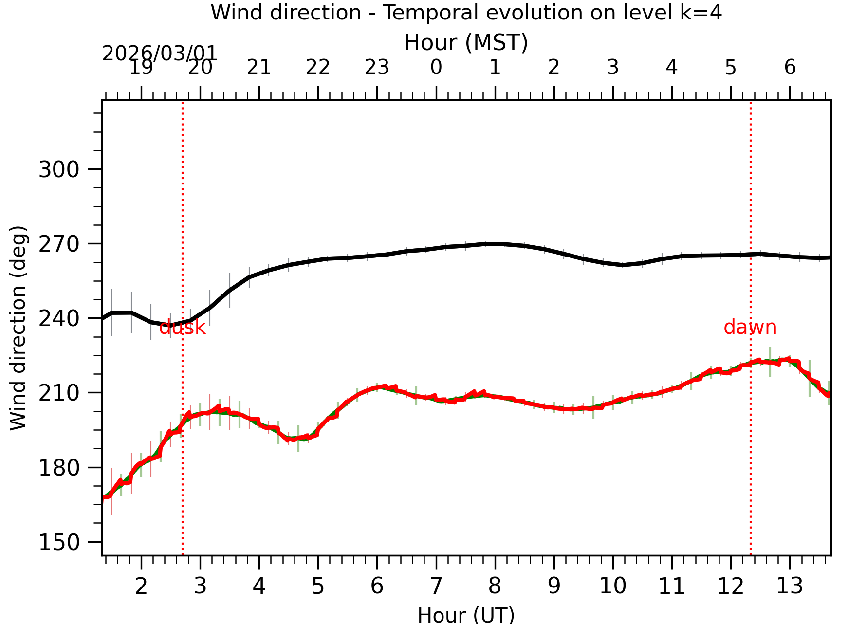 Fig. 6: Wind direction temporal evolution between the sunset and the sunrise at [38-62]m.