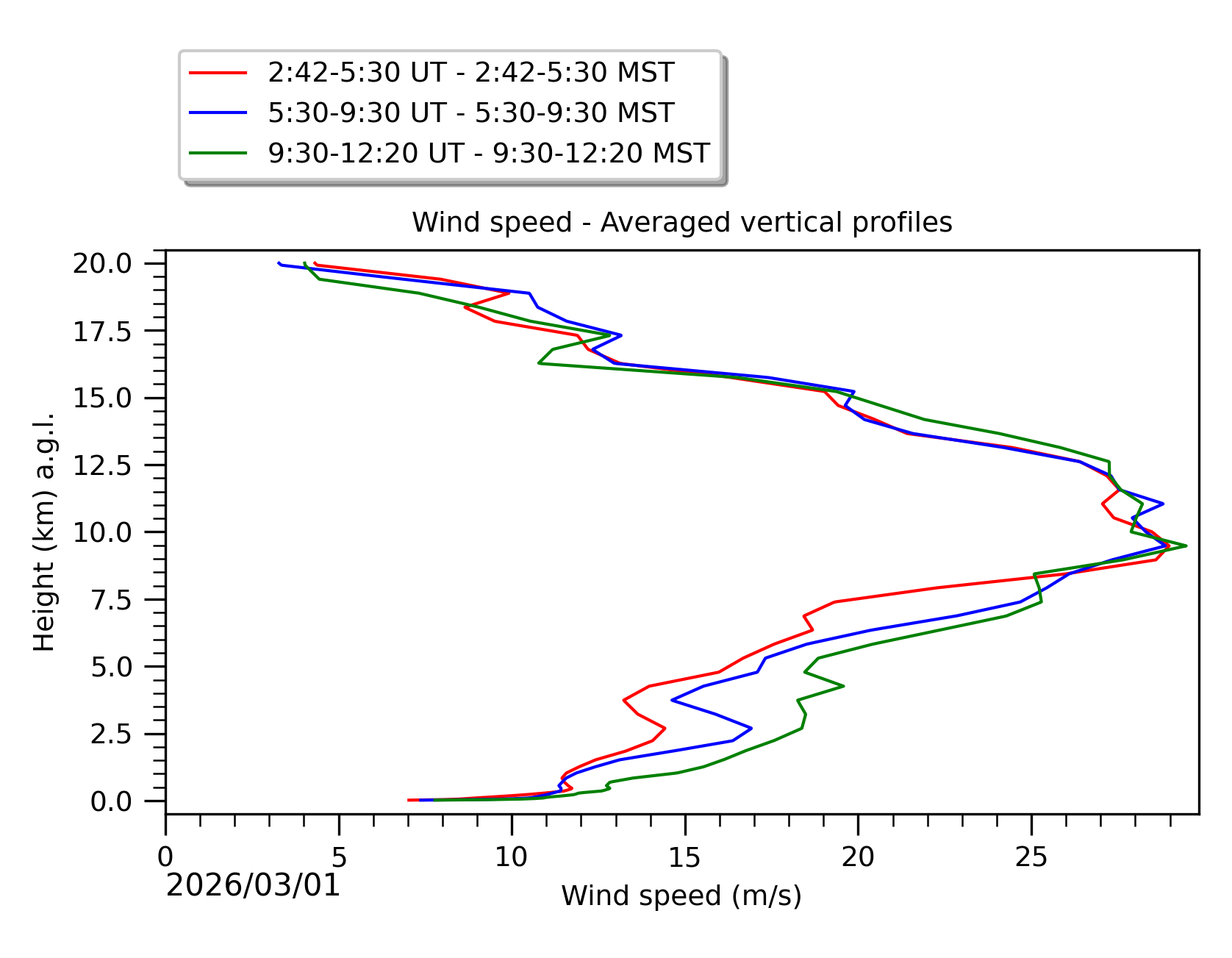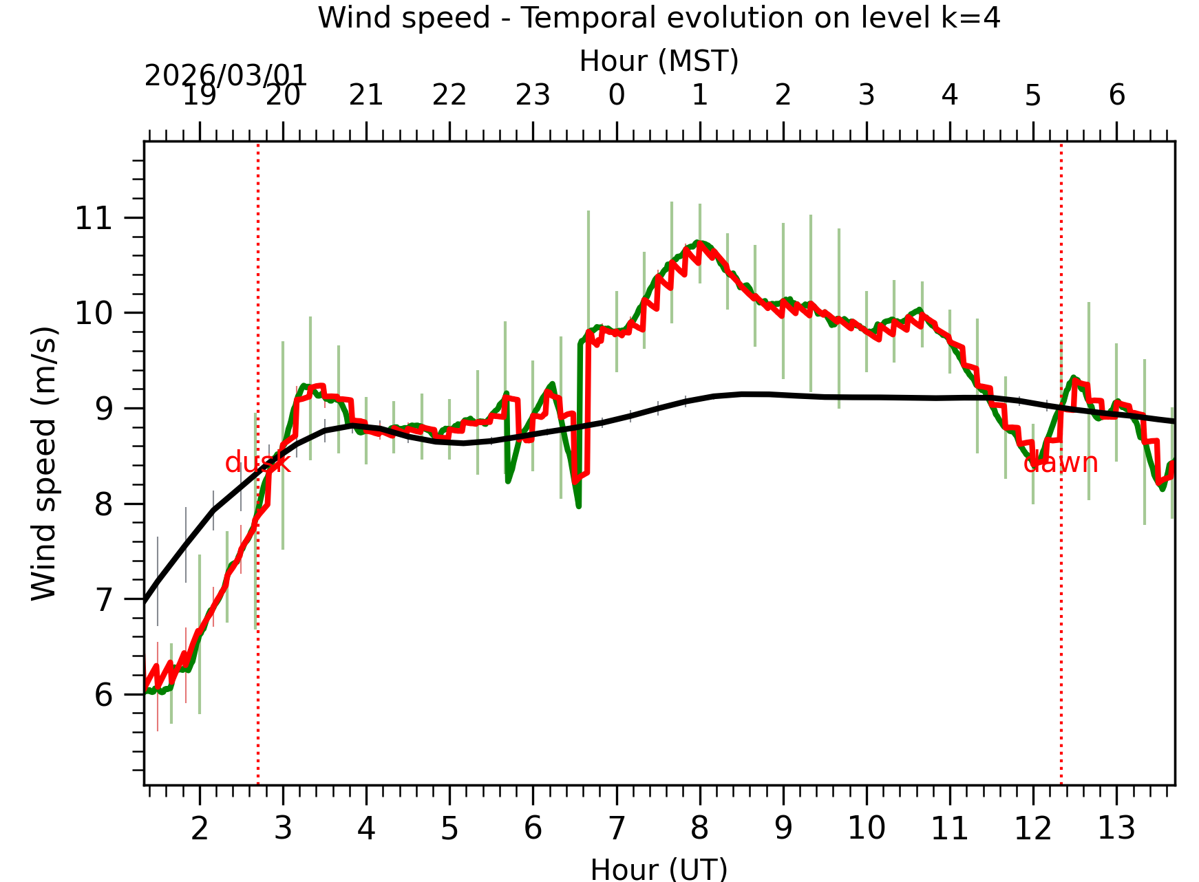 Fig. 8: Averaged wind speed in the three successive periods of the night (see red, blue and green intervals).