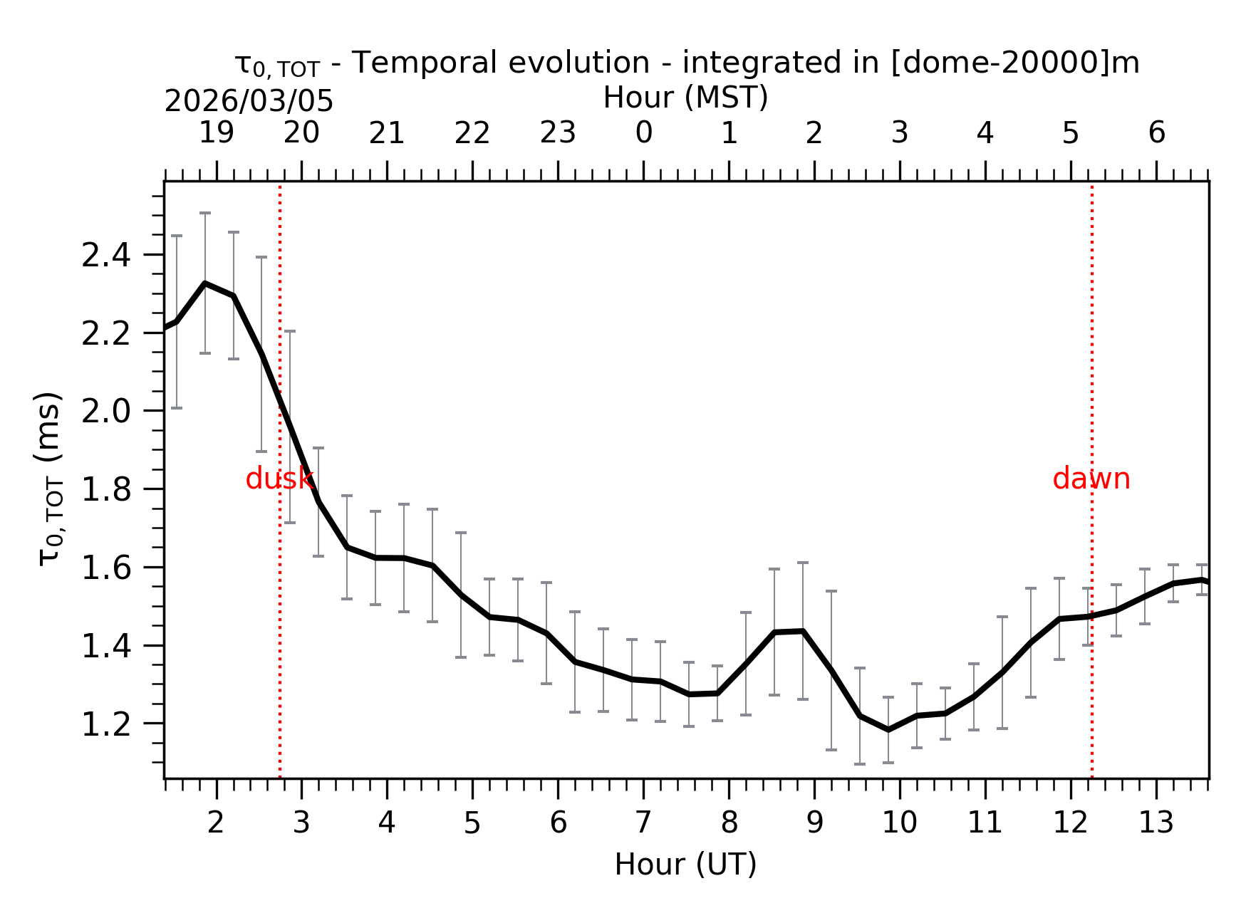 Fig. 3: Temporal evolution of τ0,TOT ([dome-20km]) between the sunset and the sunrise. |