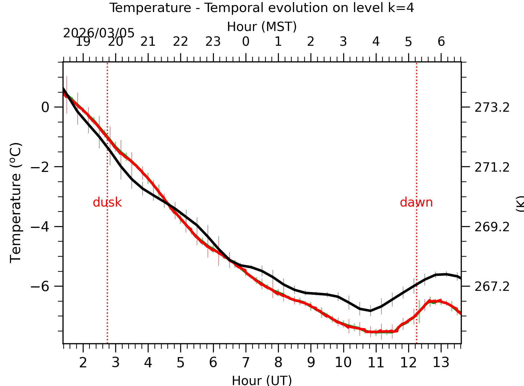 Fig. 4: Absolute temperature temporal evolution between the sunset and the sunrise at [38-62]m. |