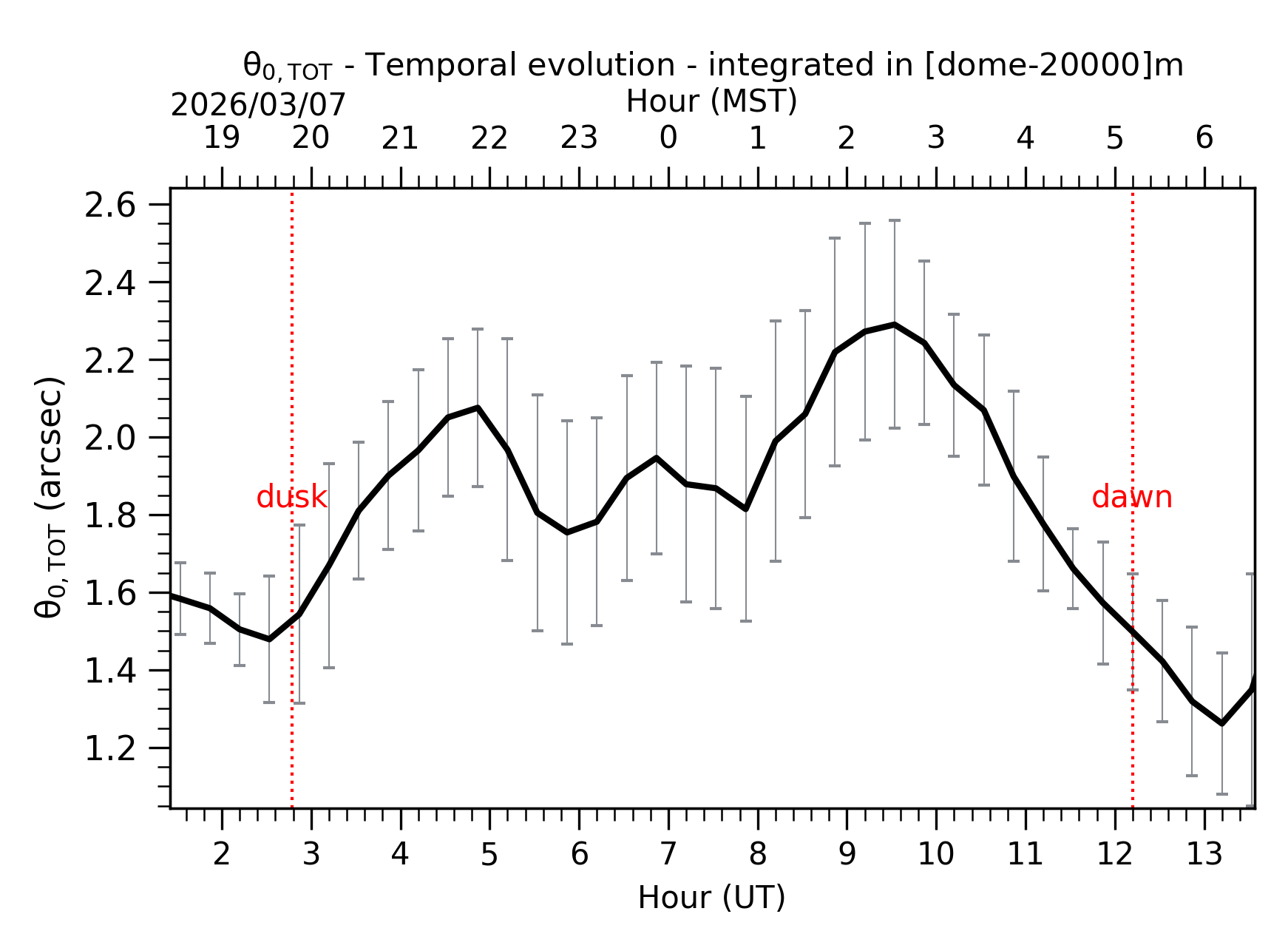 Fig. 2: Temporal evolution of θ0,TOT ([dome-20km]) between the sunset and the sunrise. |