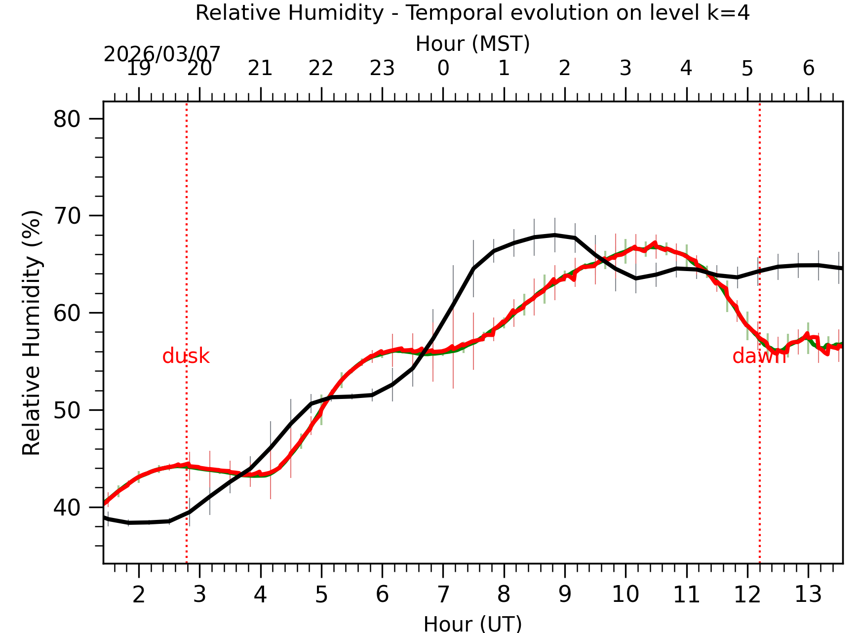 Fig. 8: Relative humidity temporal evolution between the sunset and the sunrise at [38-62]m. |