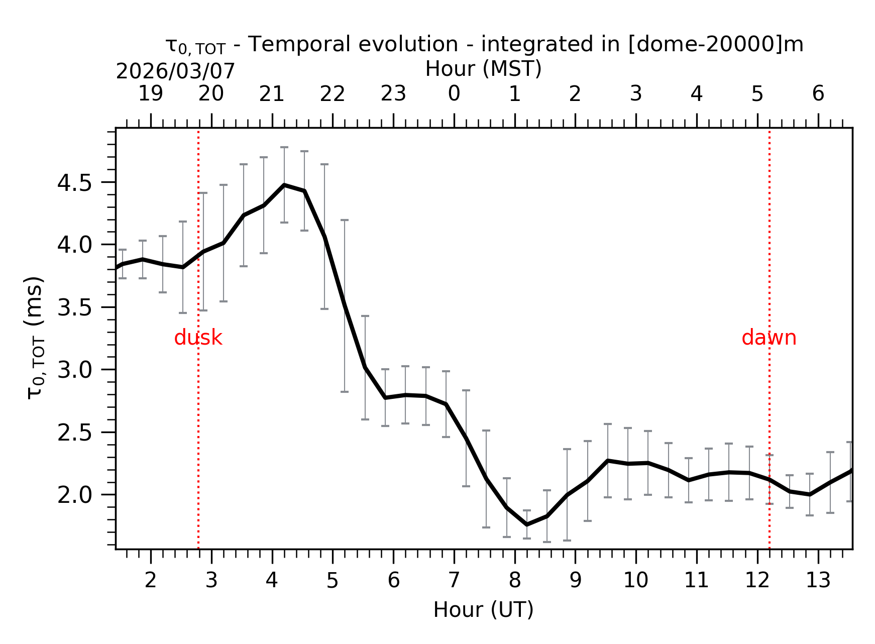 Fig. 3: Temporal evolution of τ0,TOT ([dome-20km]) between the sunset and the sunrise. |