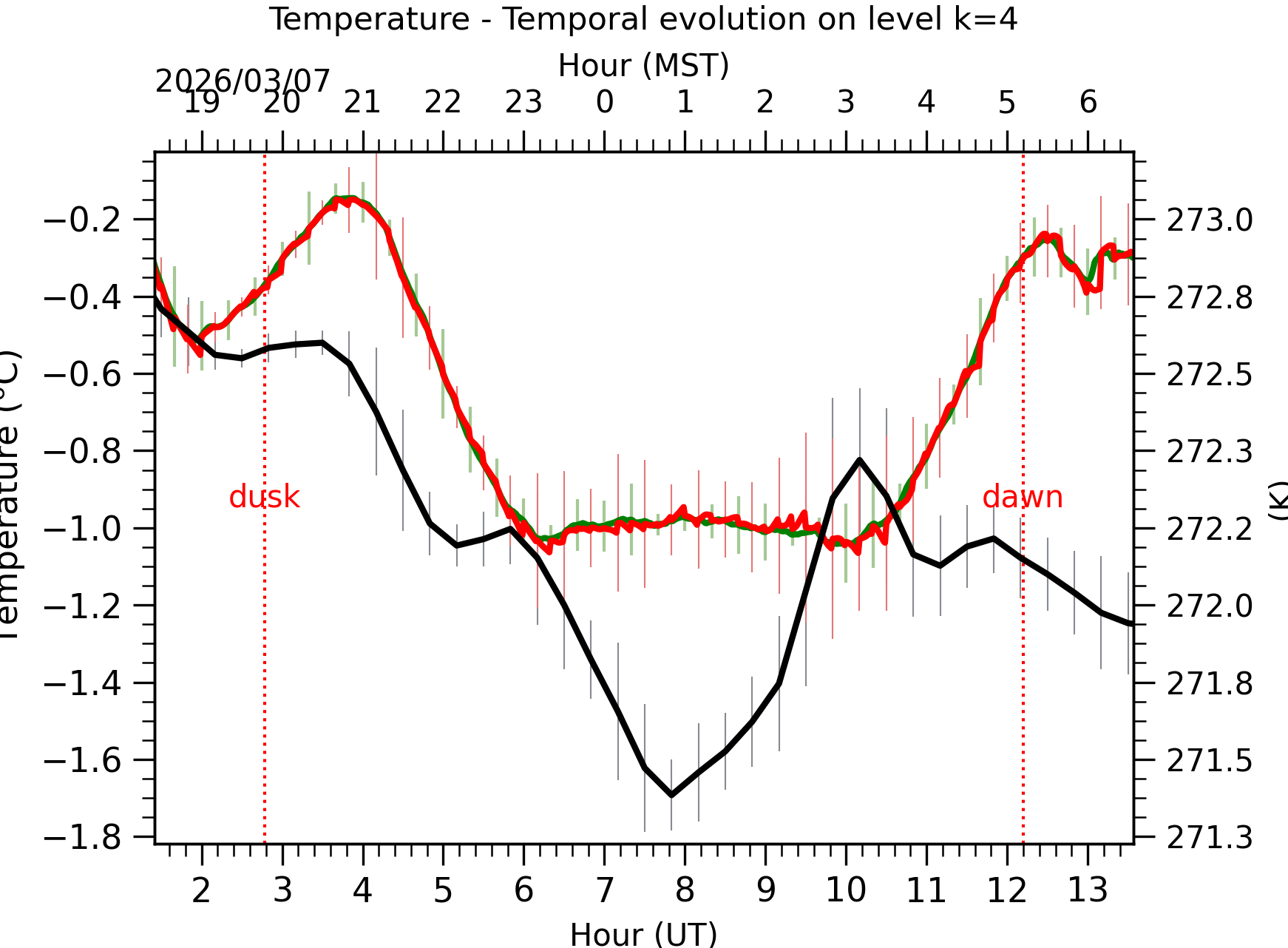 Fig. 4: Absolute temperature temporal evolution between the sunset and the sunrise at [38-62]m. |