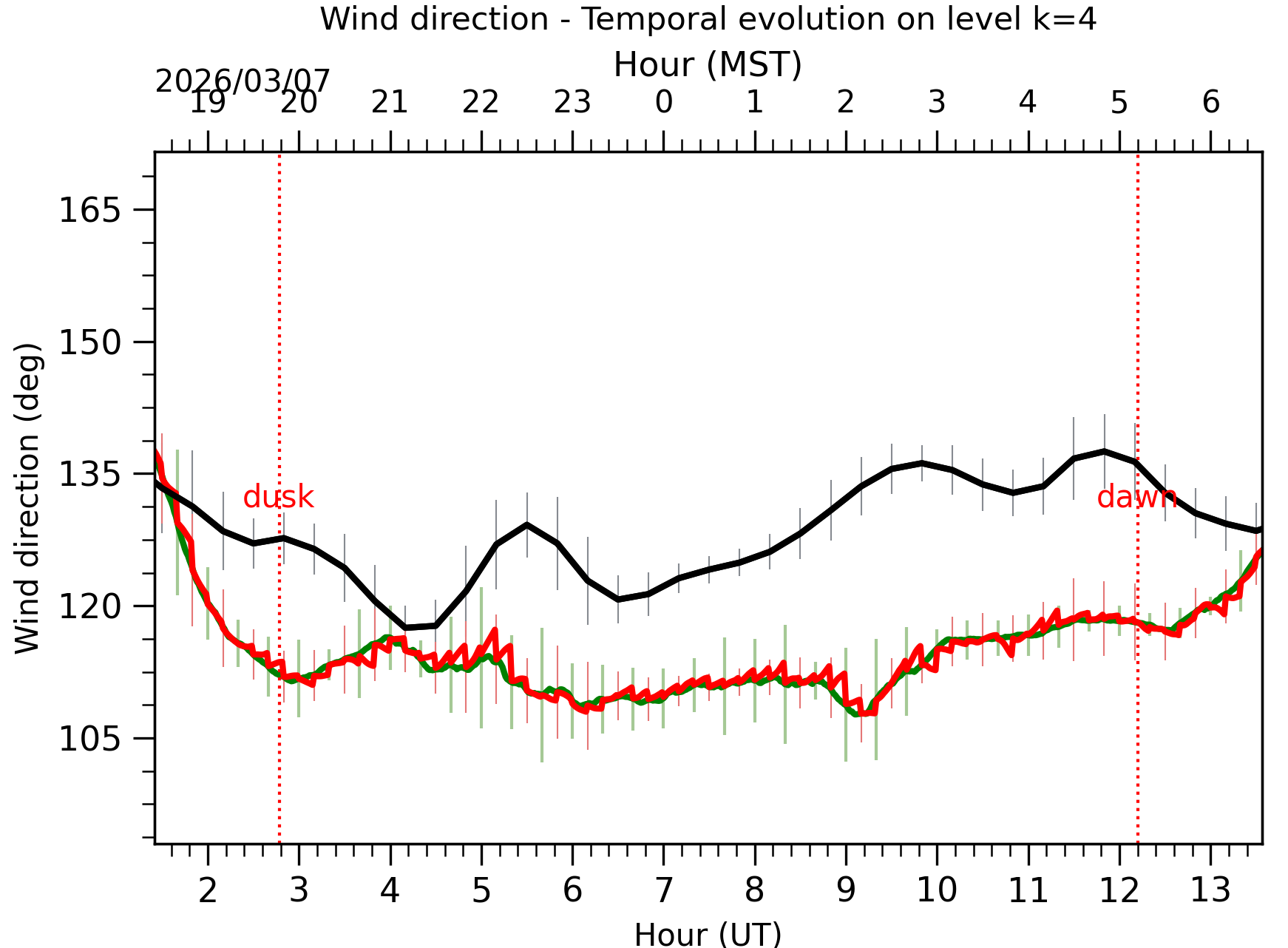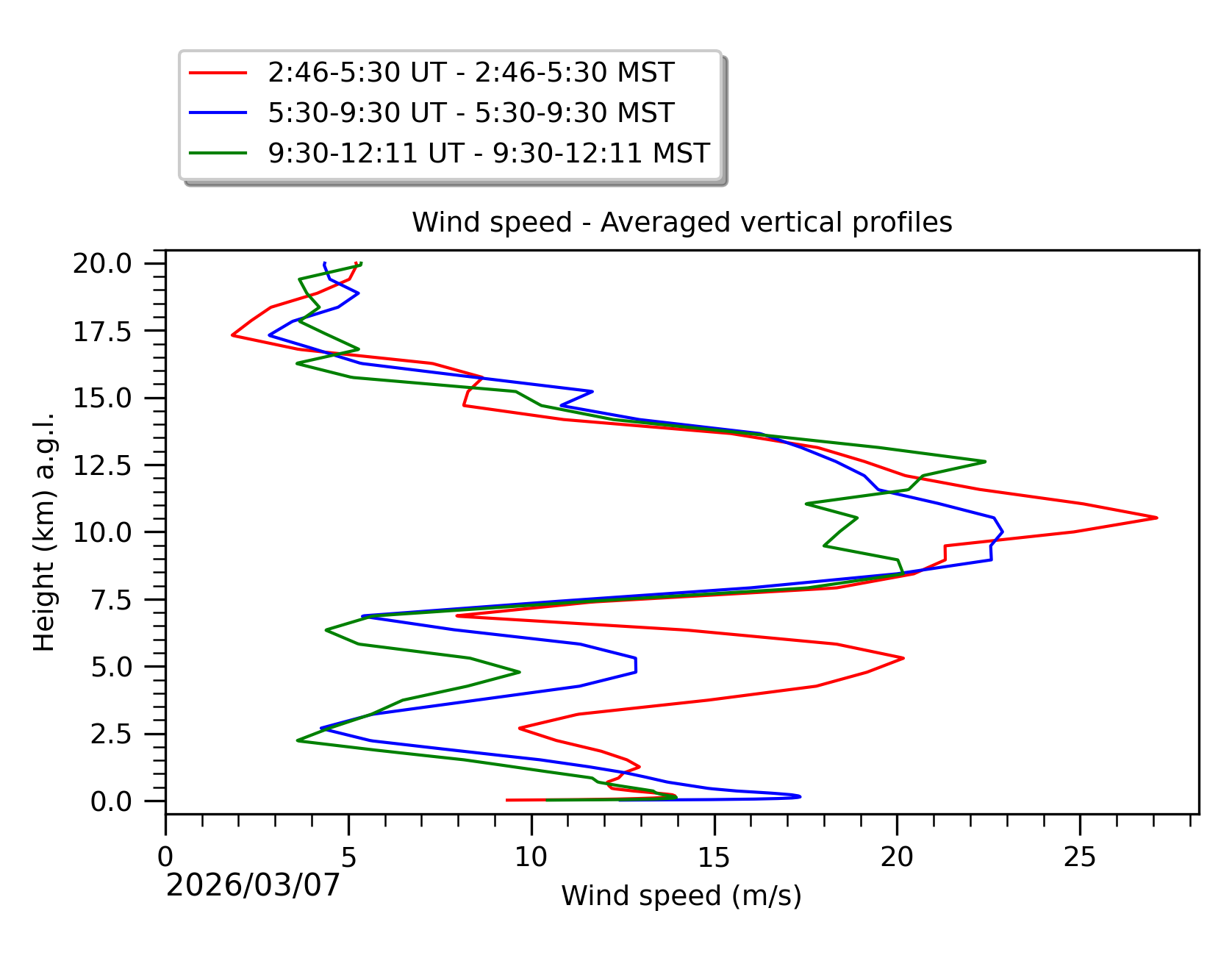 Fig. 8: Averaged wind speed in the three successive periods of the night (see red, blue and green intervals). |