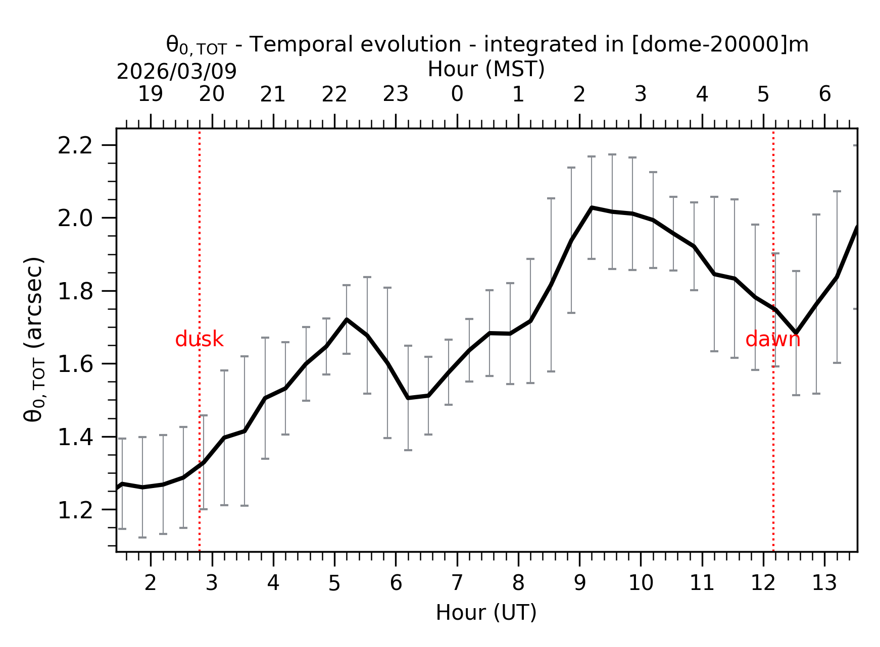 Fig. 2: Temporal evolution of θ0,TOT ([dome-20km]) between the sunset and the sunrise. |