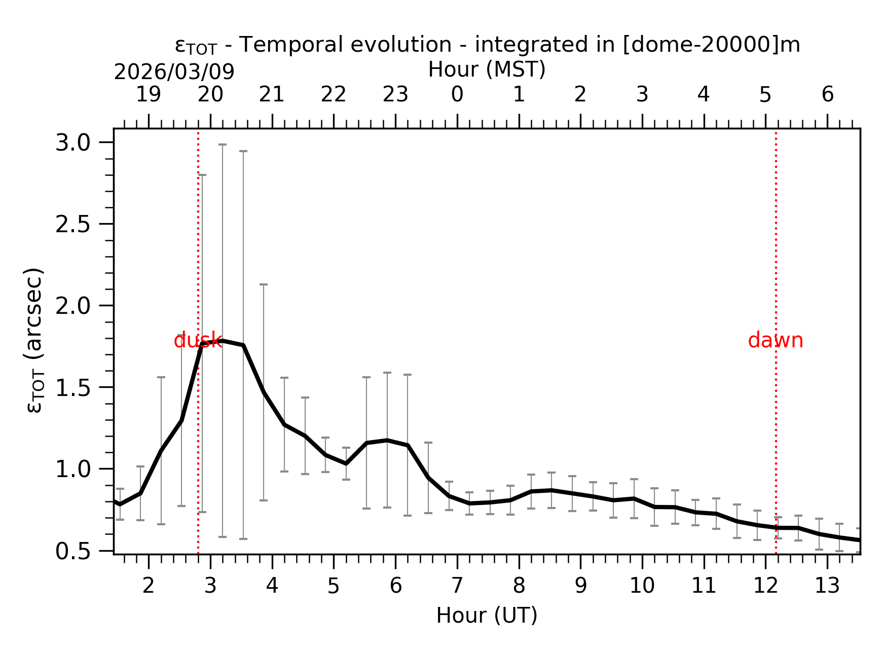 Fig. 1: Temporal evolution of εTOT ([dome-20km]) between the sunset and the sunrise. |