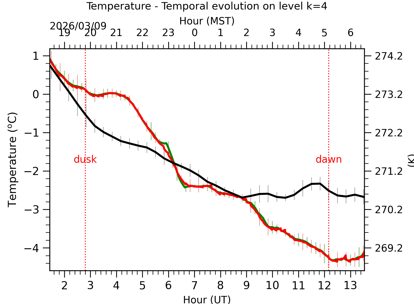 Fig. 4: Absolute temperature temporal evolution between the sunset and the sunrise at [38-62]m. |