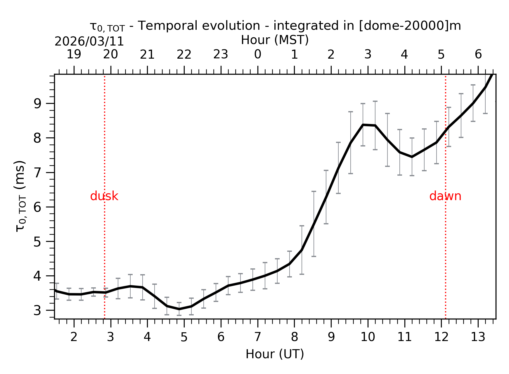 Fig. 2: Temporal evolution of θ0,TOT ([dome-20km]) between the sunset and the sunrise. |