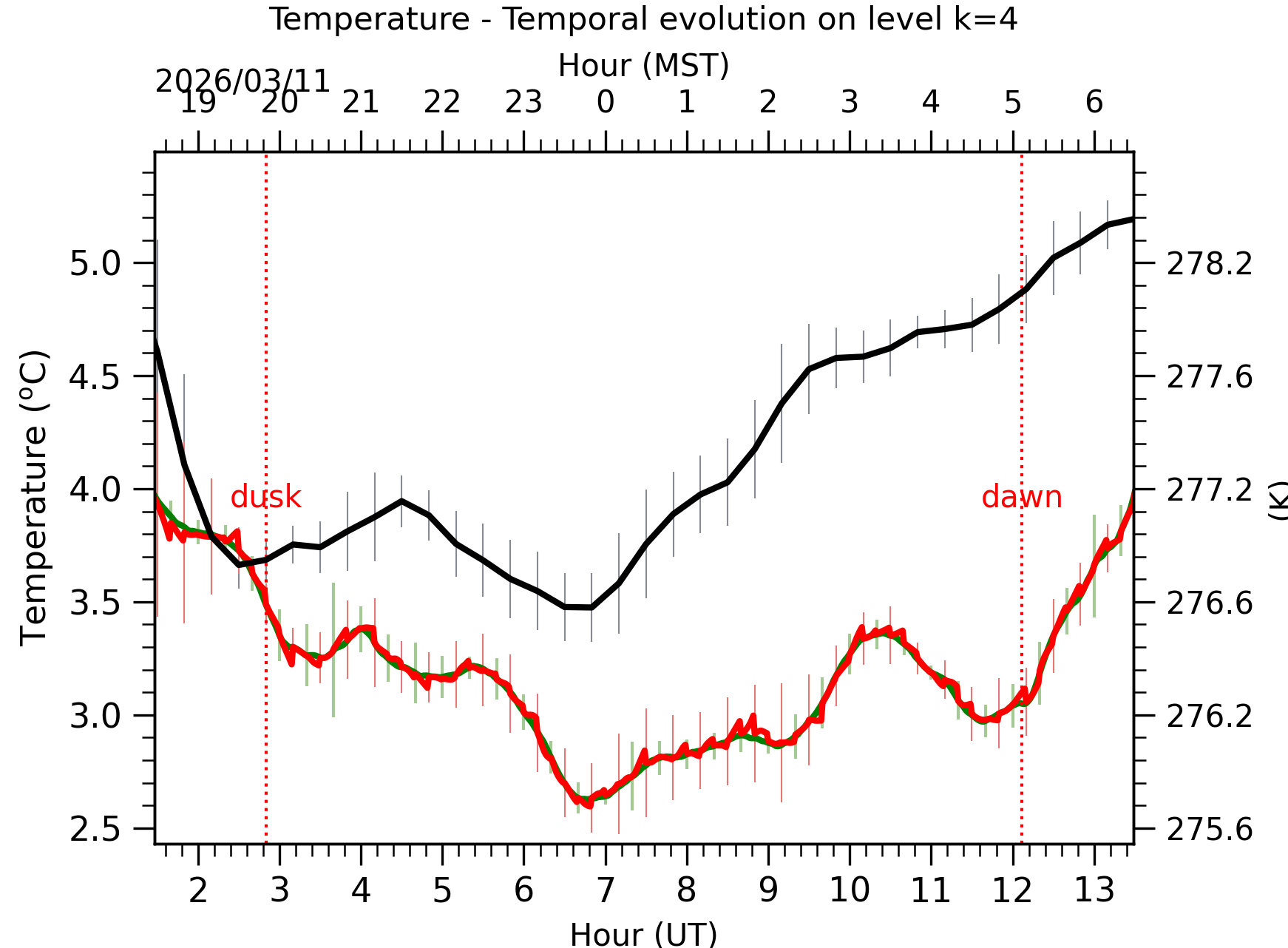 Fig. 4: Absolute temperature temporal evolution between the sunset and the sunrise at [38-62]m. |