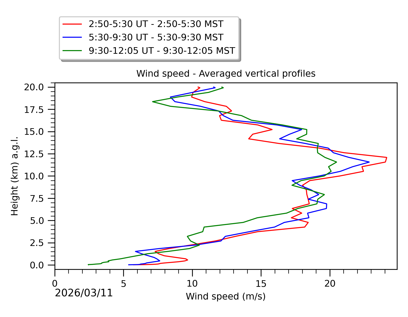 Fig. 8: Averaged wind speed in the three successive periods of the night (see red, blue and green intervals). |
