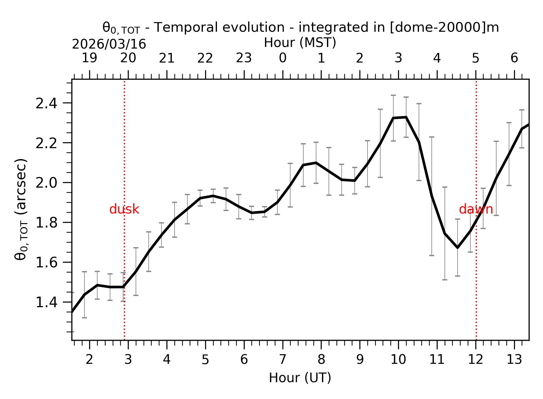 Fig. 2: Temporal evolution of θ0,TOT ([dome-20km]) between the sunset and the sunrise. |