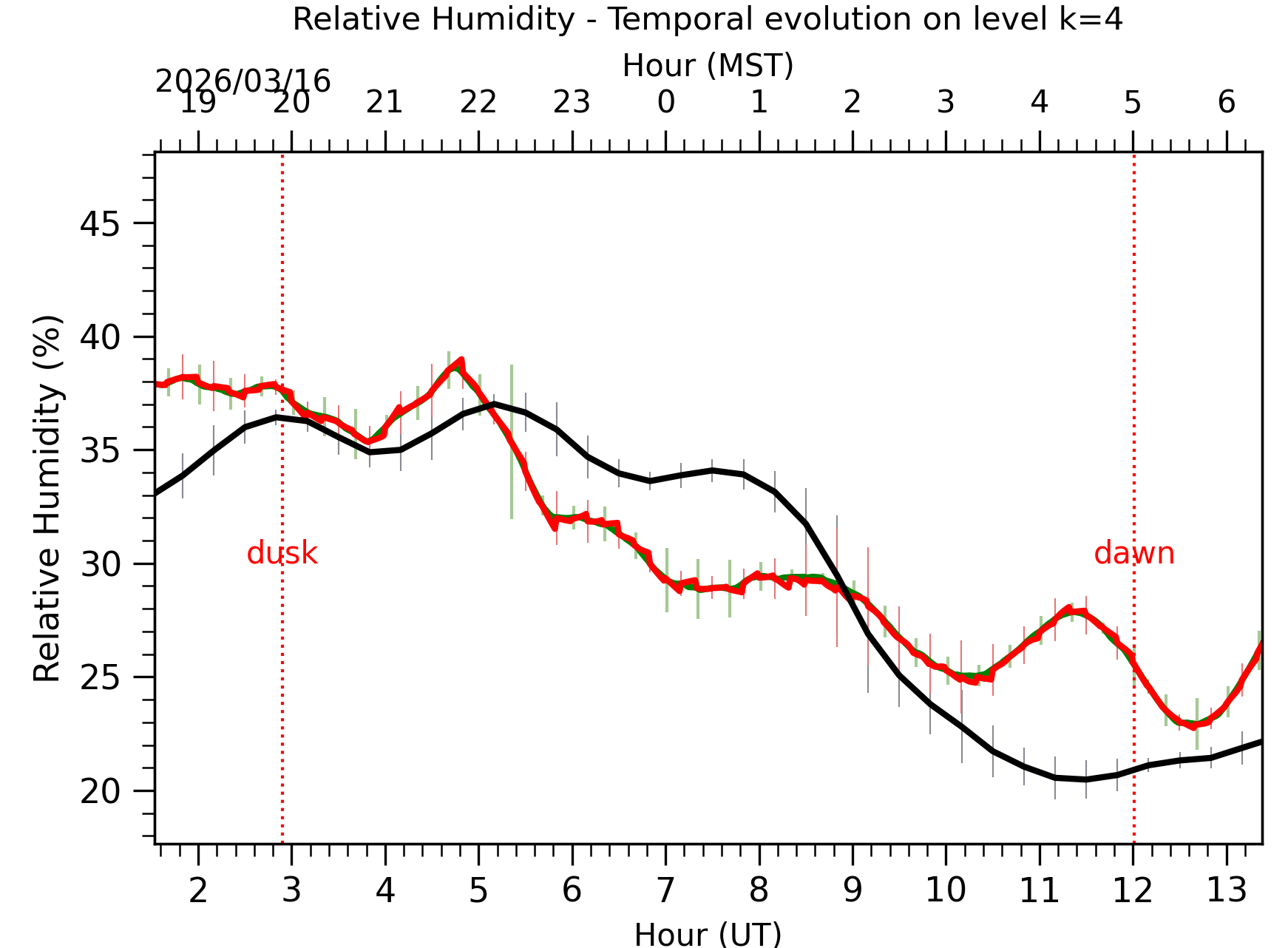 Fig. 8: Relative humidity temporal evolution between the sunset and the sunrise at [38-62]m. |