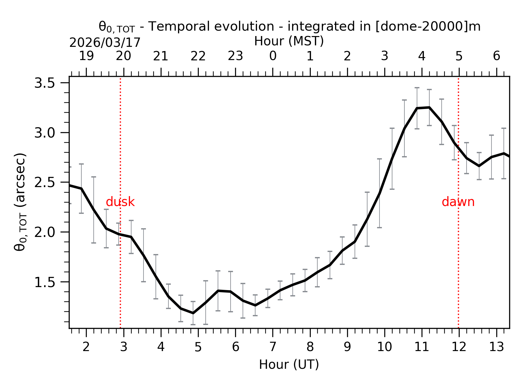 Fig. 2: Temporal evolution of θ0,TOT ([dome-20km]) between the sunset and the sunrise.