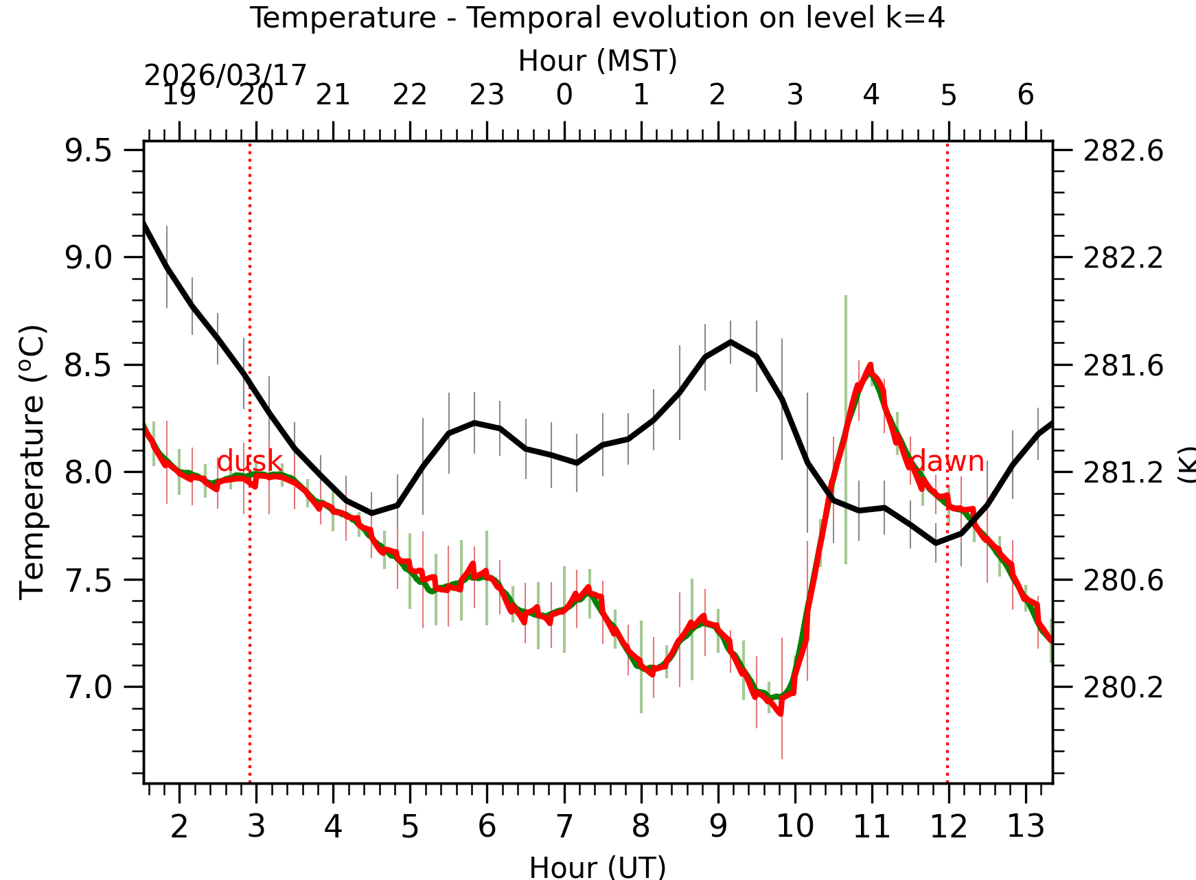 Fig. 4: Absolute temperature temporal evolution between the sunset and the sunrise at [38-62]m.