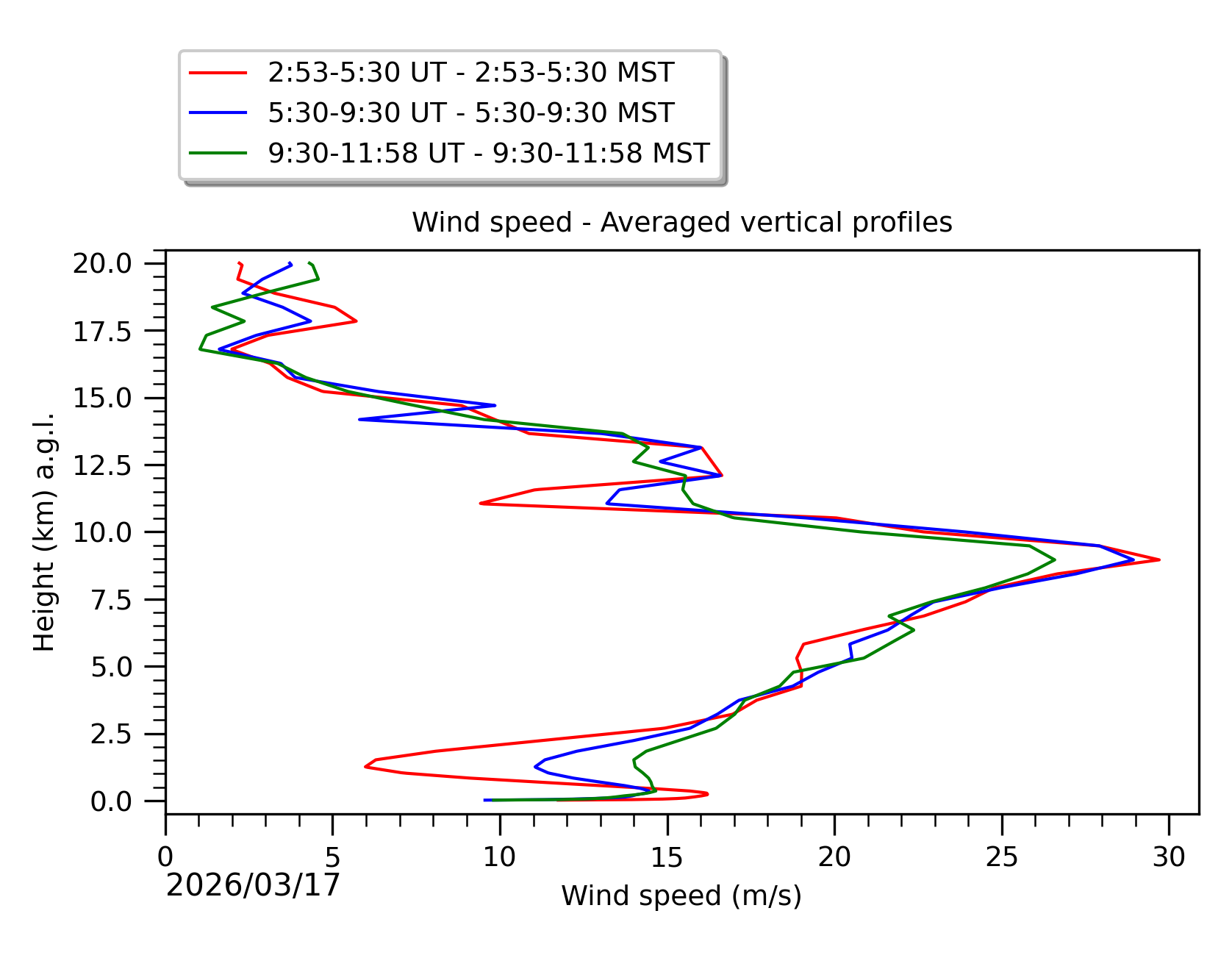 Fig. 8: Averaged wind speed in the three successive periods of the night (see red, blue and green intervals).