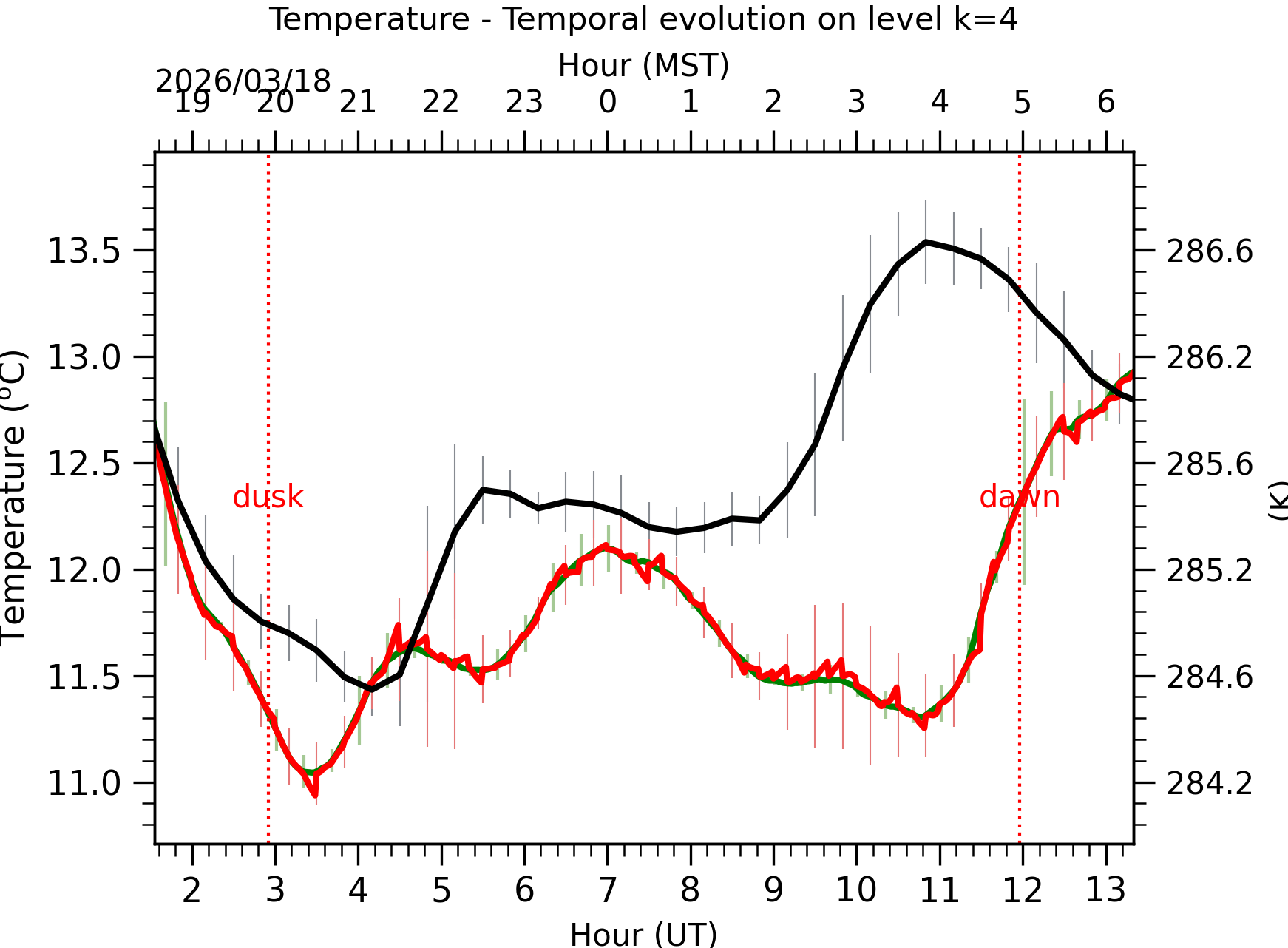 Fig. 4: Absolute temperature temporal evolution between the sunset and the sunrise at [38-62]m. |