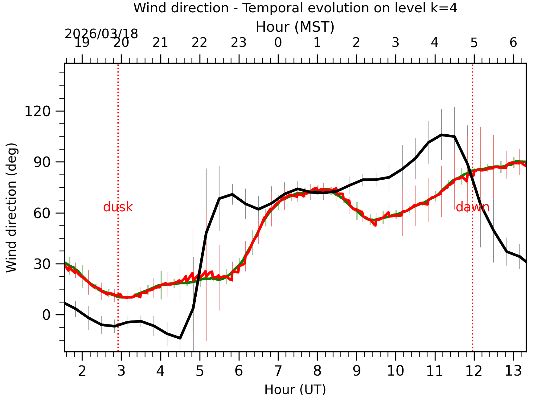 Fig. 6: Wind direction temporal evolution between the sunset and the sunrise at [38-62]m. |