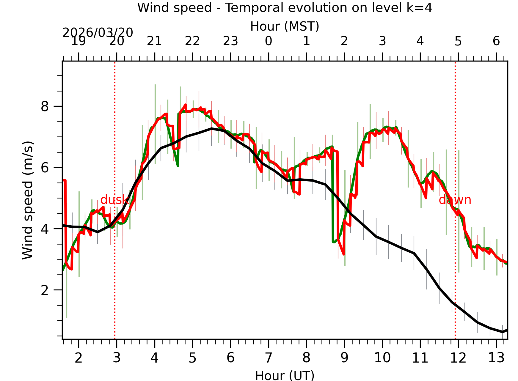 Fig. 8: Averaged wind speed in the three successive periods of the night (see red, blue and green intervals).