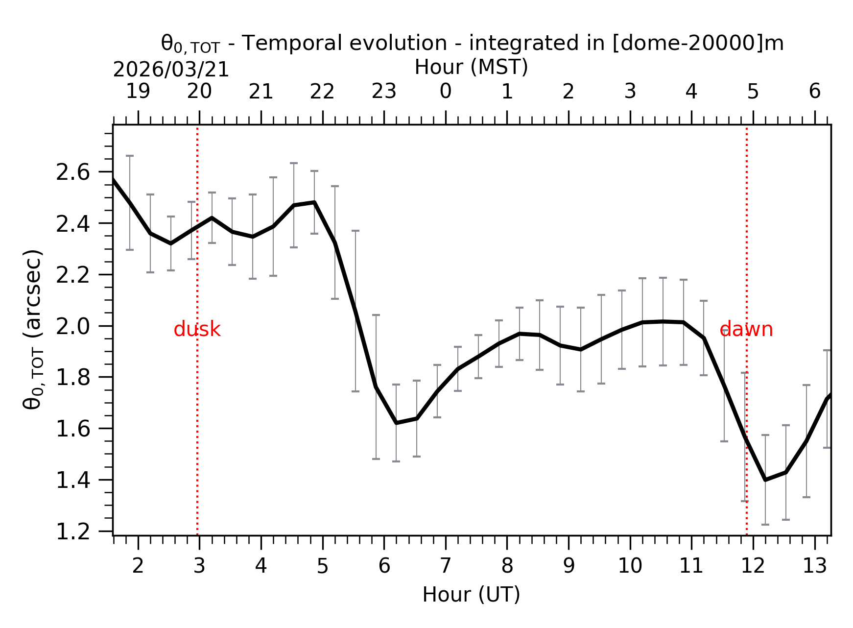 Fig. 2: Temporal evolution of θ0,TOT ([dome-20km]) between the sunset and the sunrise. |