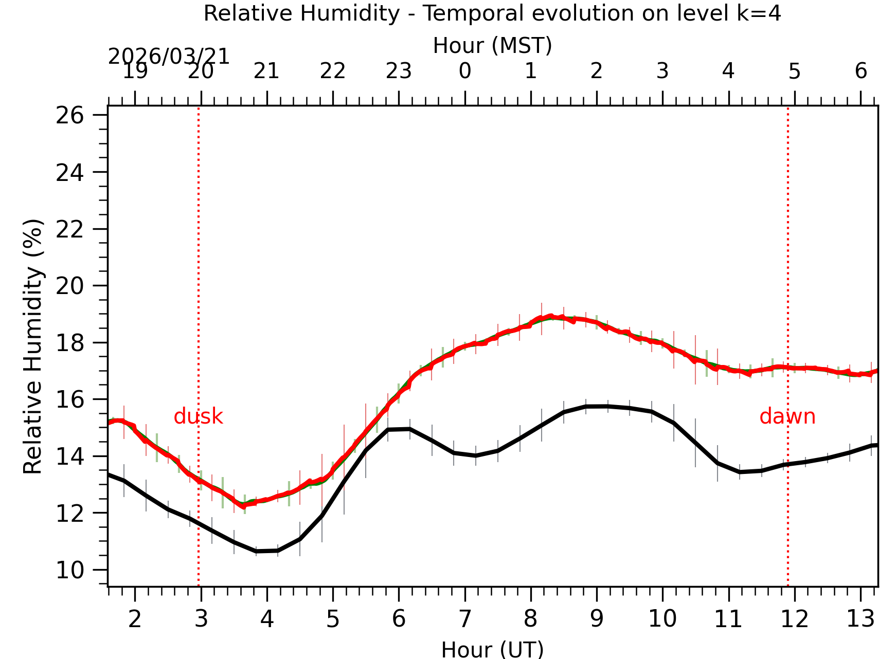 Fig. 8: Relative humidity temporal evolution between the sunset and the sunrise at [38-62]m. |