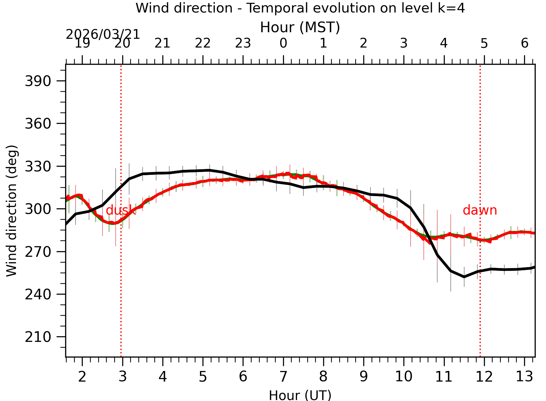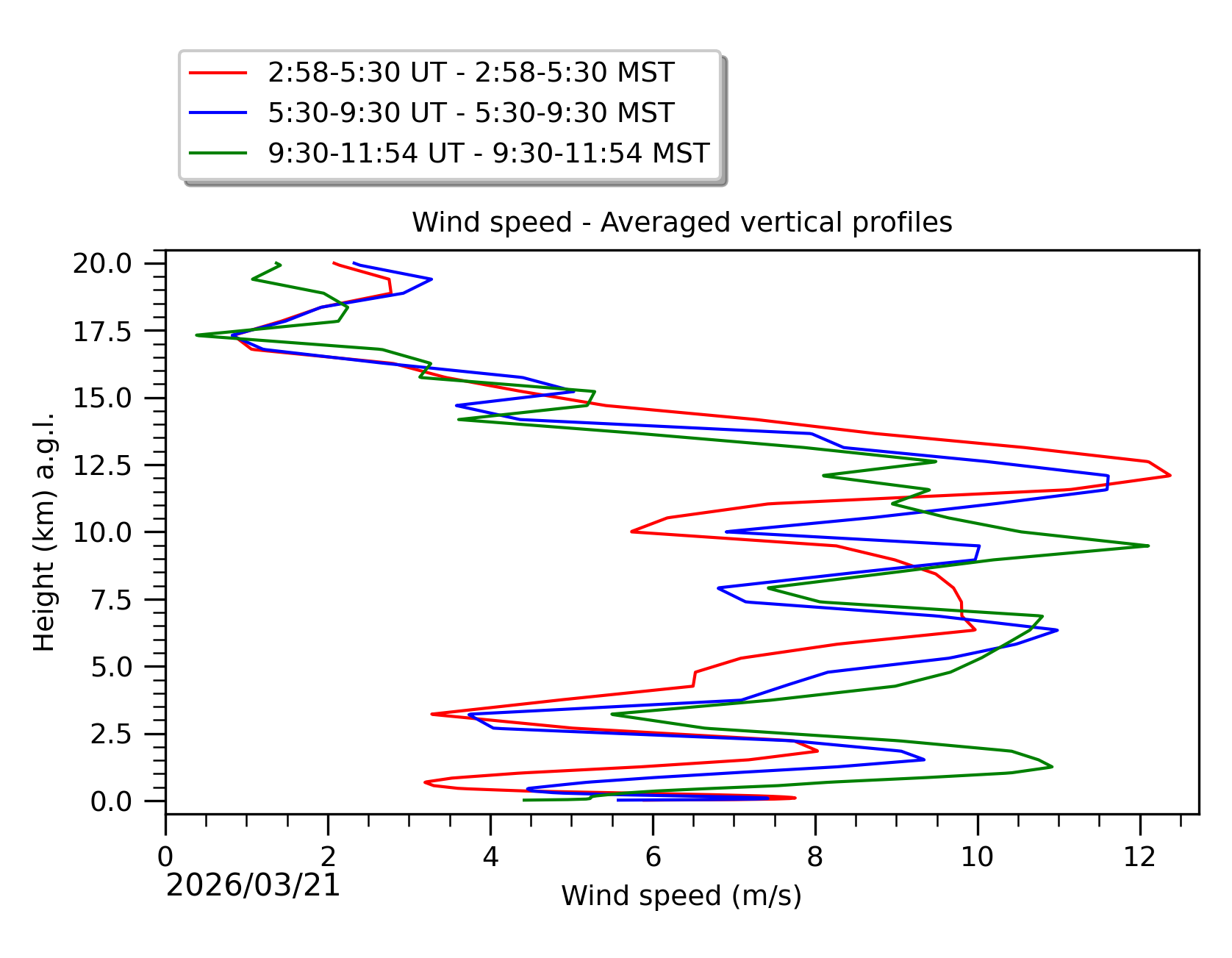 Fig. 8: Averaged wind speed in the three successive periods of the night (see red, blue and green intervals). |