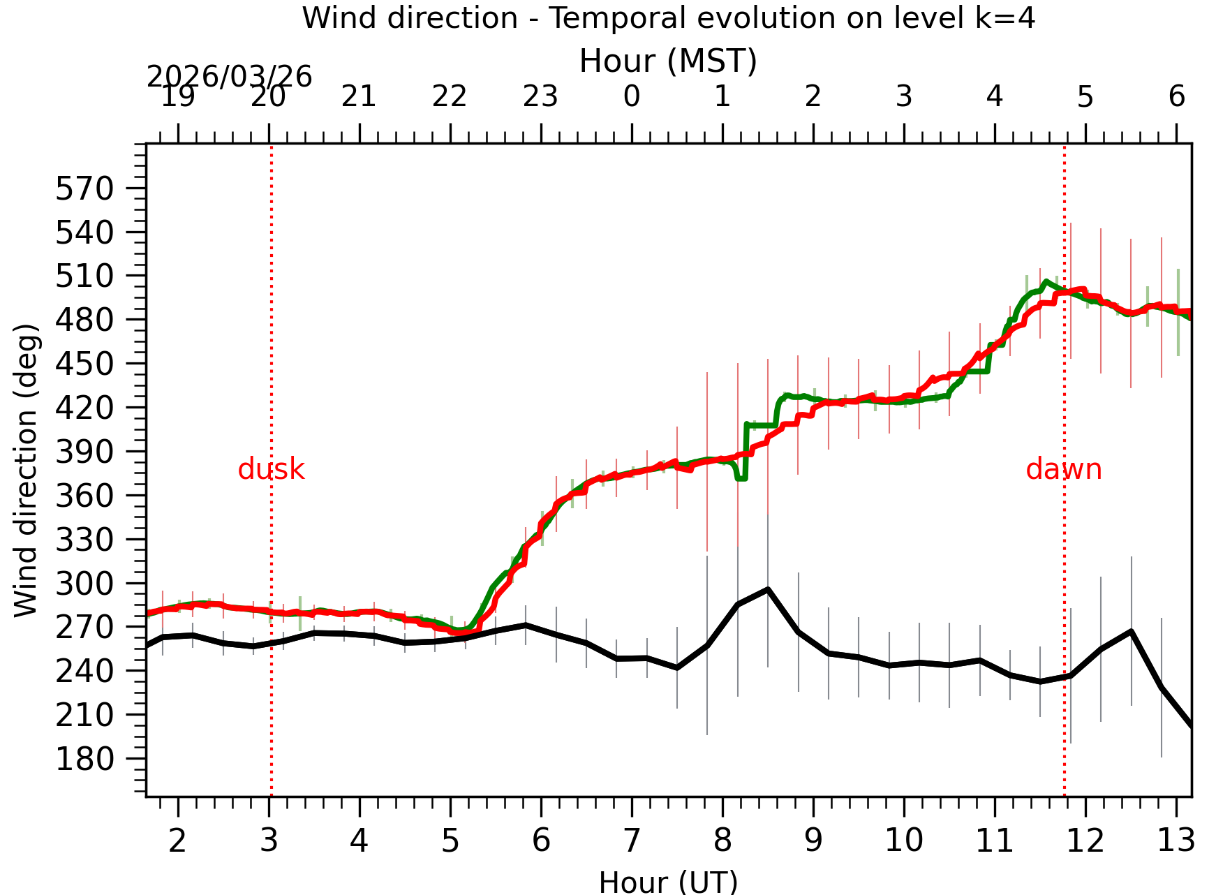 Fig. 8: Averaged wind speed in the three successive periods of the night (see red, blue and green intervals). |