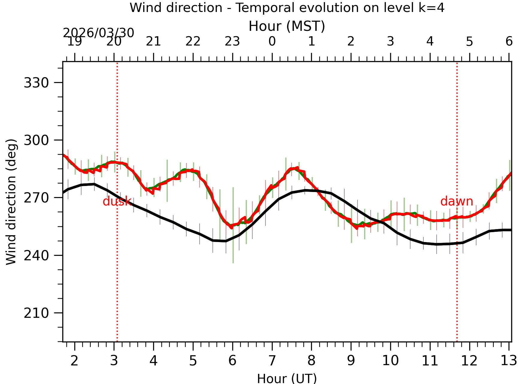 Fig. 8: Averaged wind speed in the three successive periods of the night (see red, blue and green intervals).
