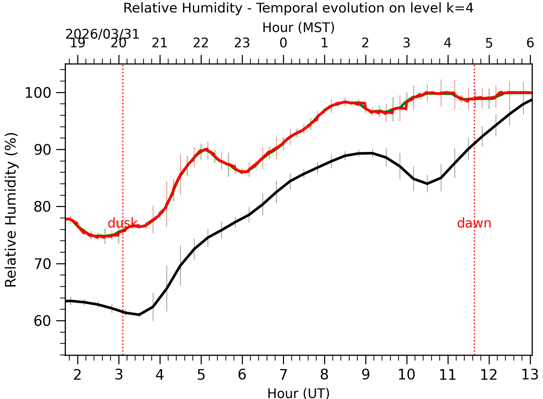 Fig. 8: Relative humidity temporal evolution between the sunset and the sunrise at [38-62]m.