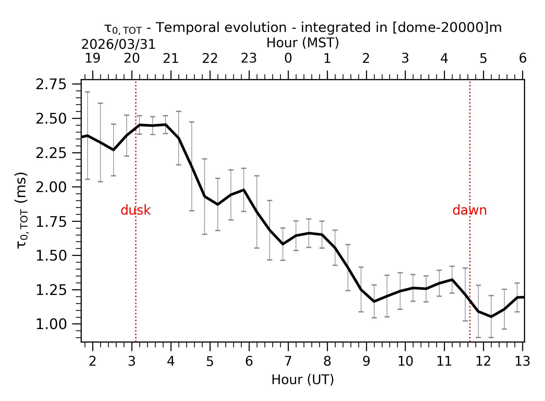 Fig. 3: Temporal evolution of τ0,TOT ([dome-20km]) between the sunset and the sunrise.