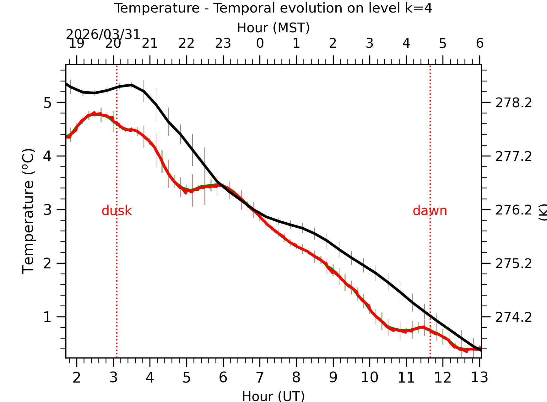 Fig. 4: Absolute temperature temporal evolution between the sunset and the sunrise at [38-62]m.