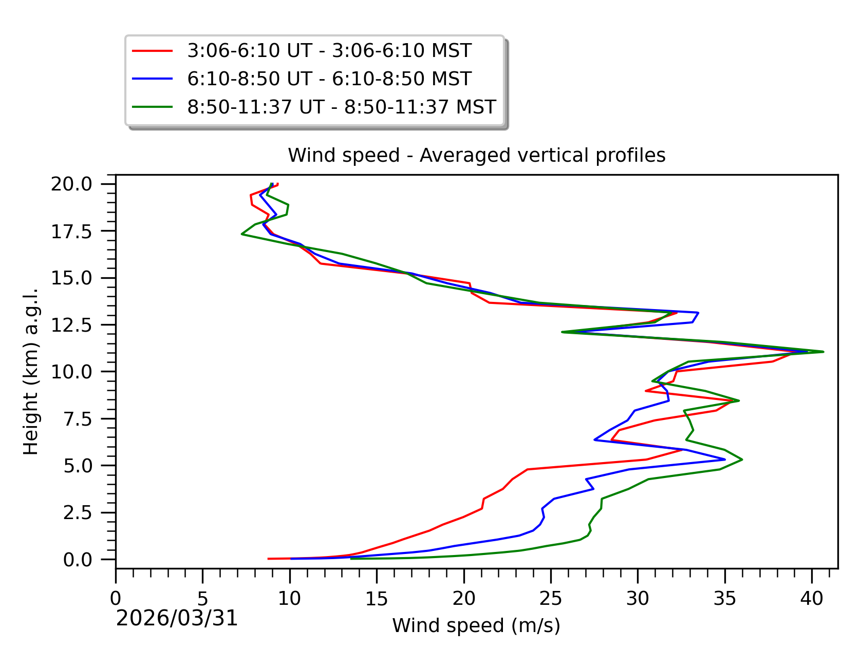 Fig. 8: Averaged wind speed in the three successive periods of the night (see red, blue and green intervals).