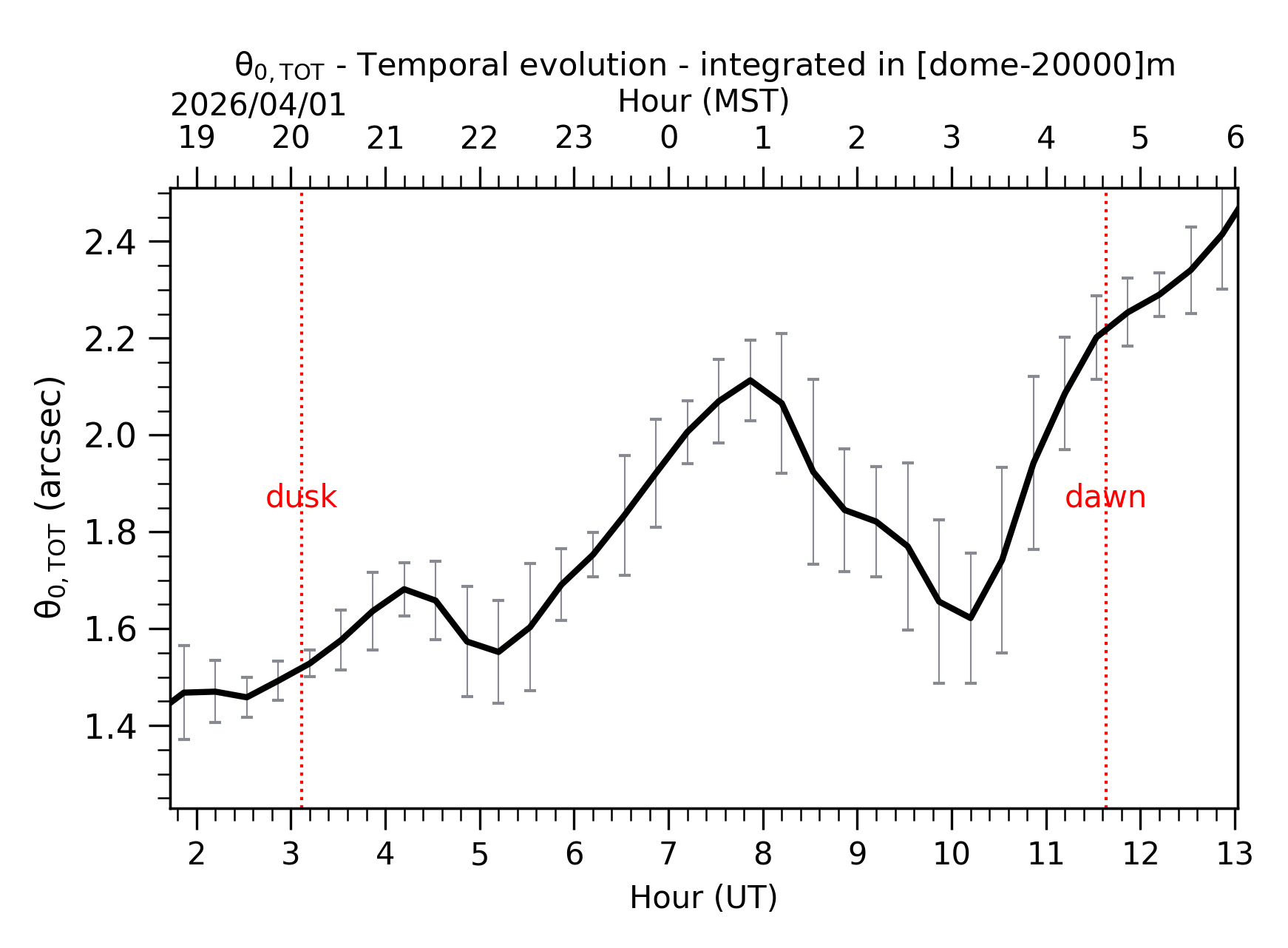 Fig. 2: Temporal evolution of θ0,TOT ([dome-20km]) between the sunset and the sunrise.
