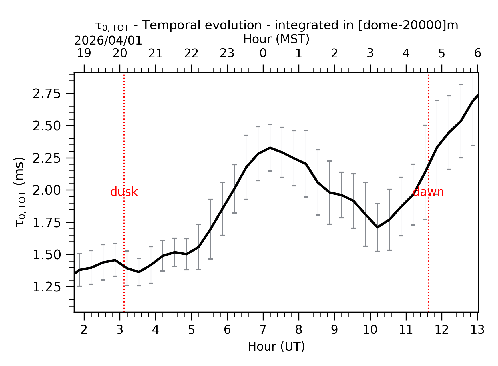 Fig. 3: Temporal evolution of τ0,TOT ([dome-20km]) between the sunset and the sunrise.