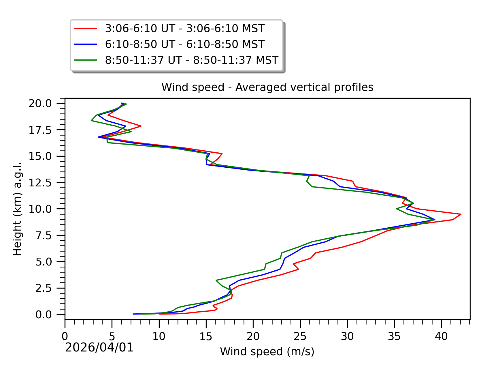 Fig. 8: Averaged wind speed in the three successive periods of the night (see red, blue and green intervals).