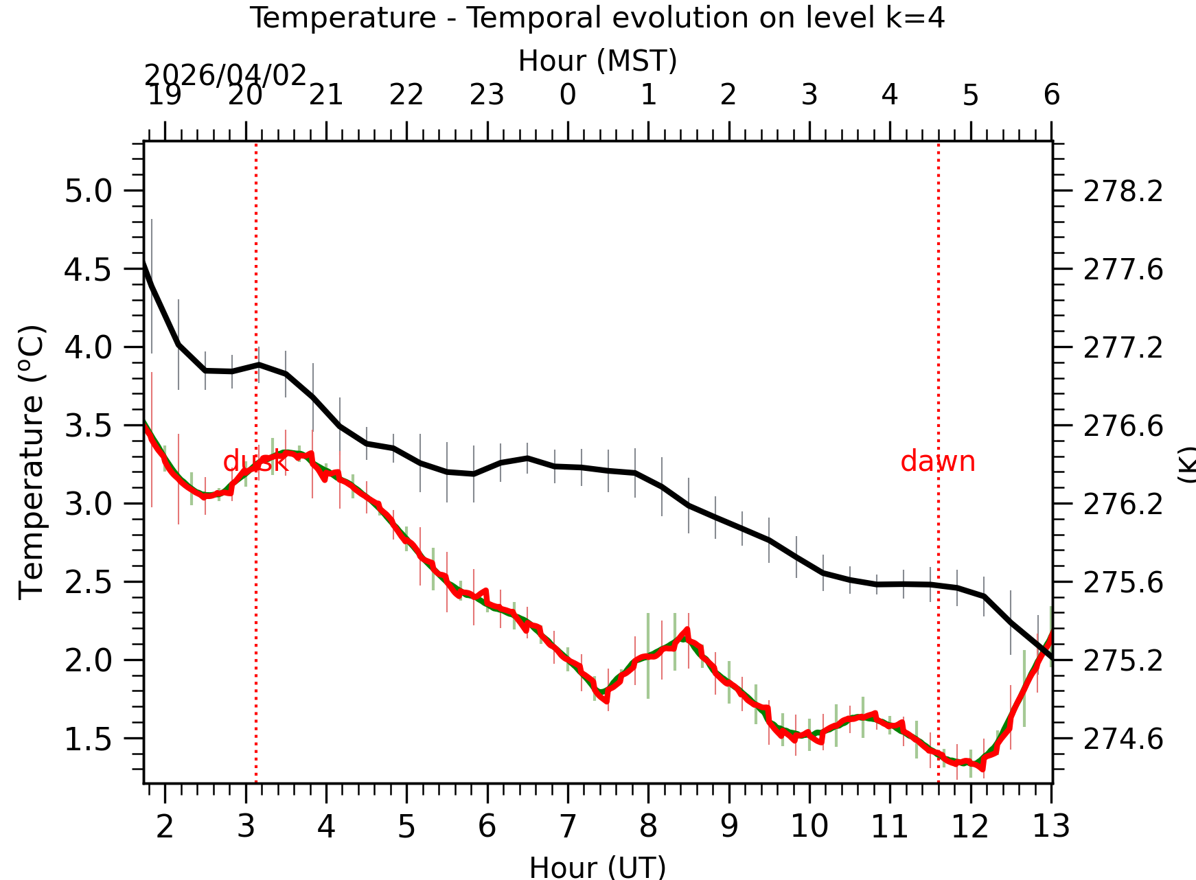 Fig. 4: Absolute temperature temporal evolution between the sunset and the sunrise at [38-62]m. |