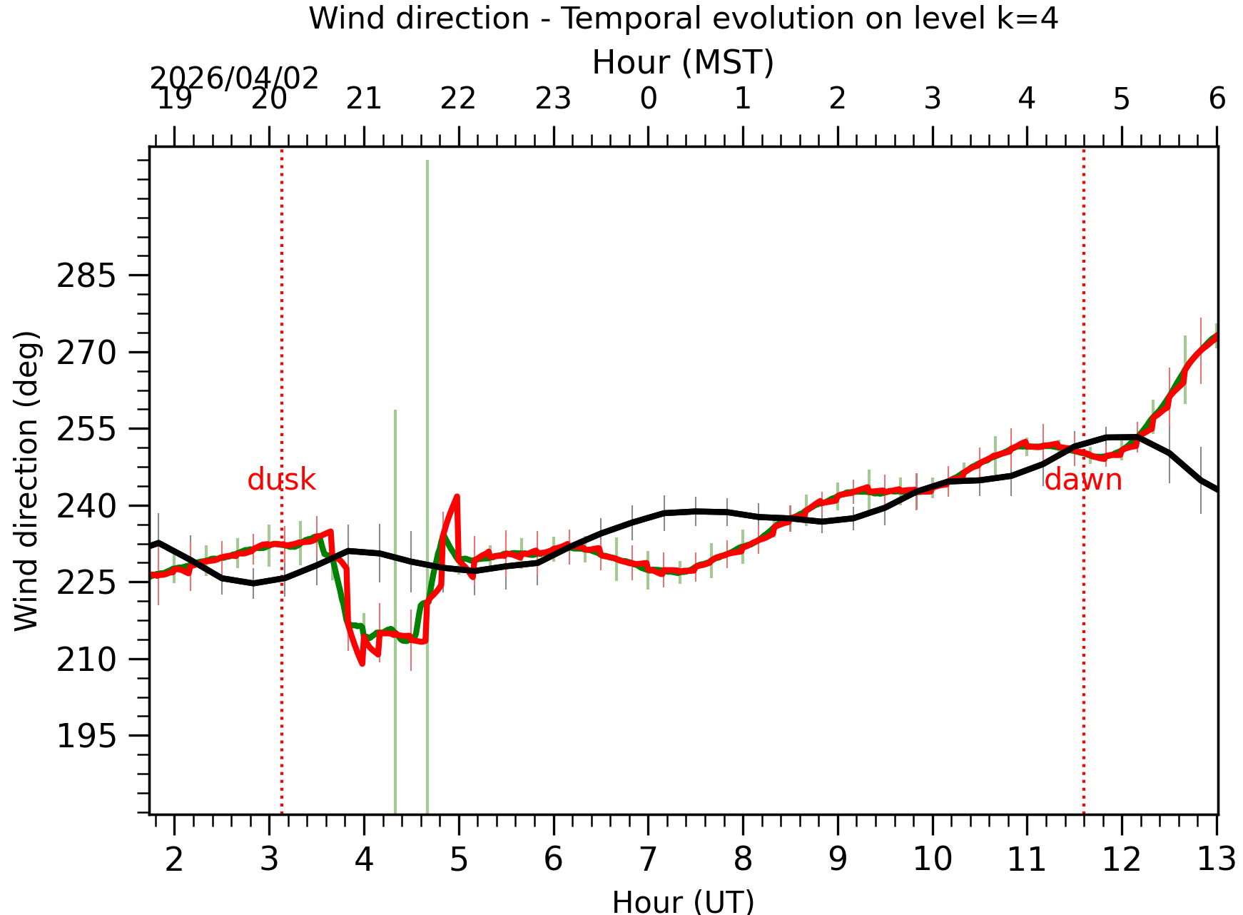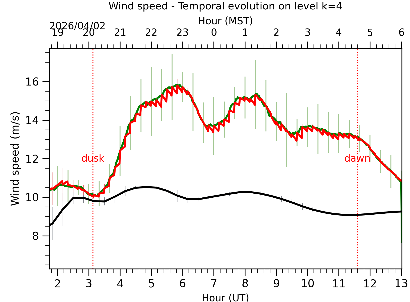 Fig. 8: Averaged wind speed in the three successive periods of the night (see red, blue and green intervals). |