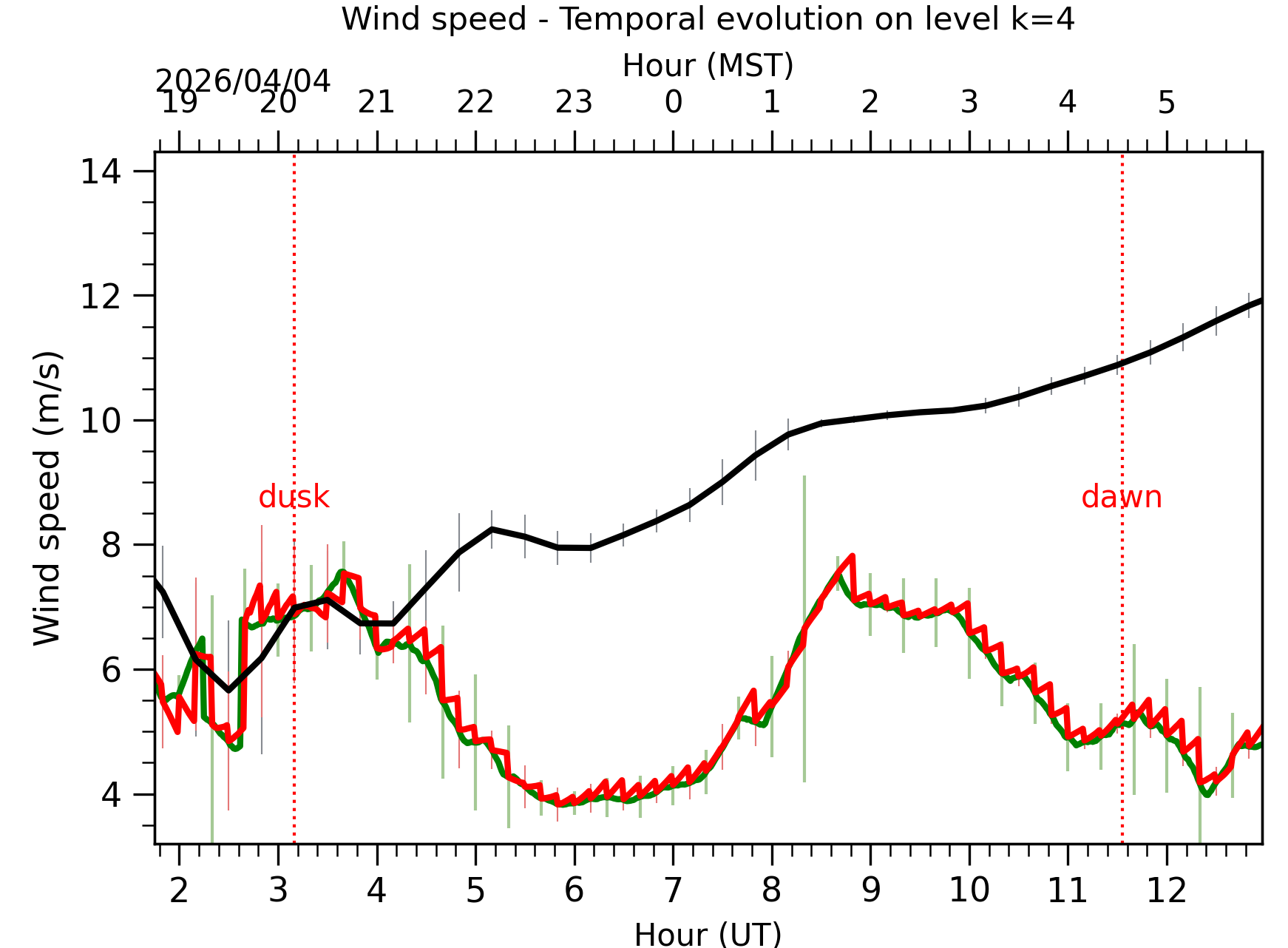 Fig. 5: Wind speed temporal evolution between the sunset and the sunrise at [38-62]m. |