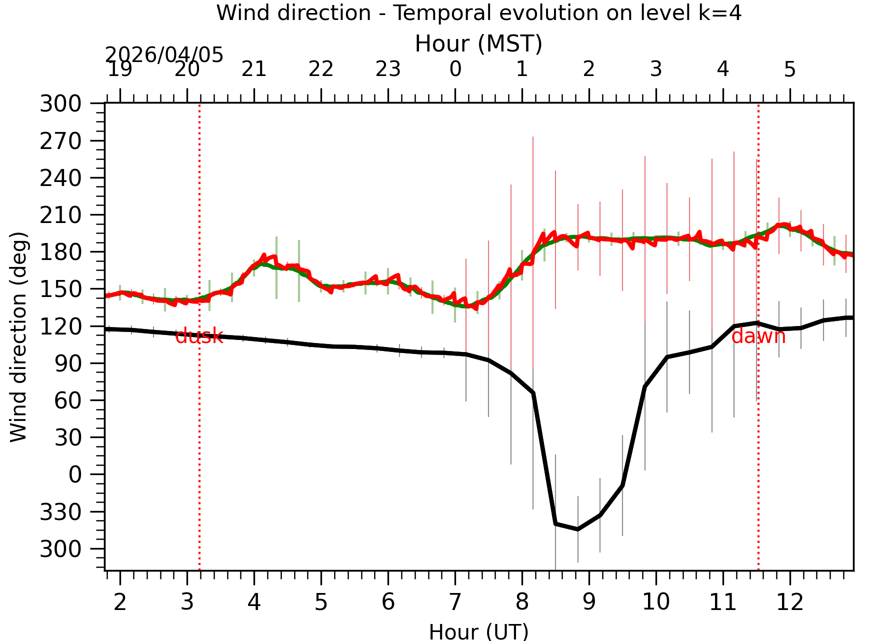 Fig. 6: Wind direction temporal evolution between the sunset and the sunrise at [38-62]m. |