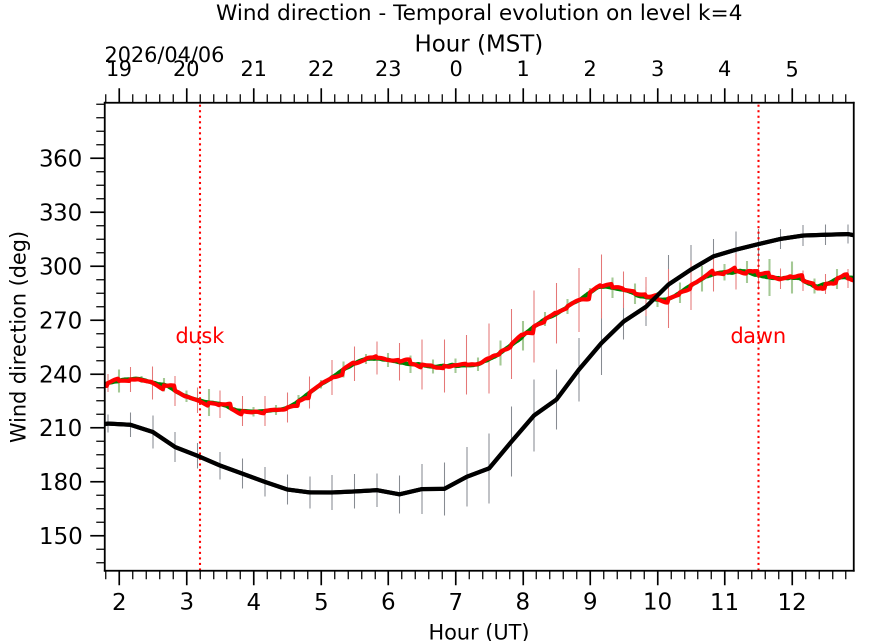 Fig. 8: Averaged wind speed in the three successive periods of the night (see red, blue and green intervals). |