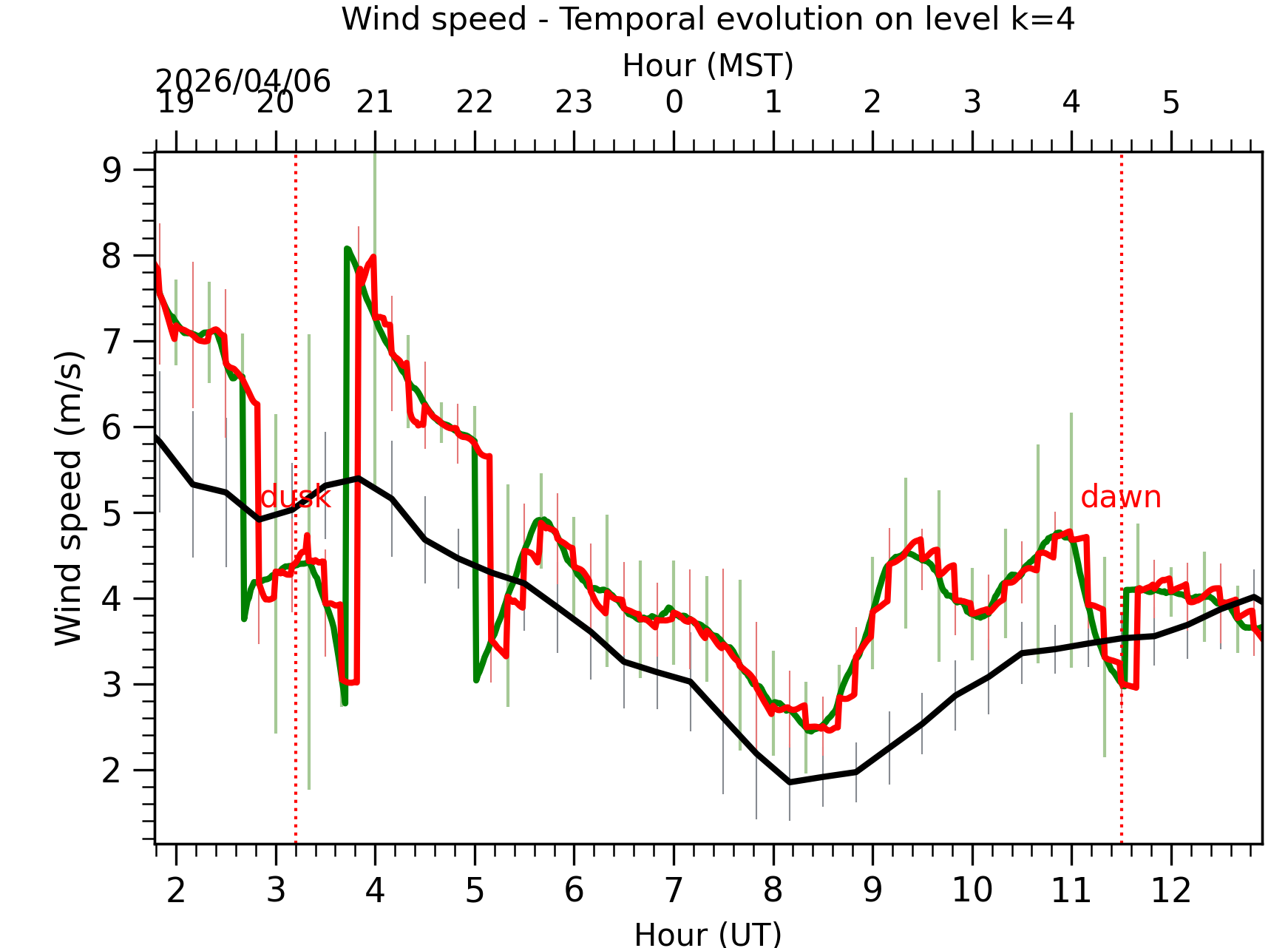 Fig. 5: Wind speed temporal evolution between the sunset and the sunrise at [38-62]m. |