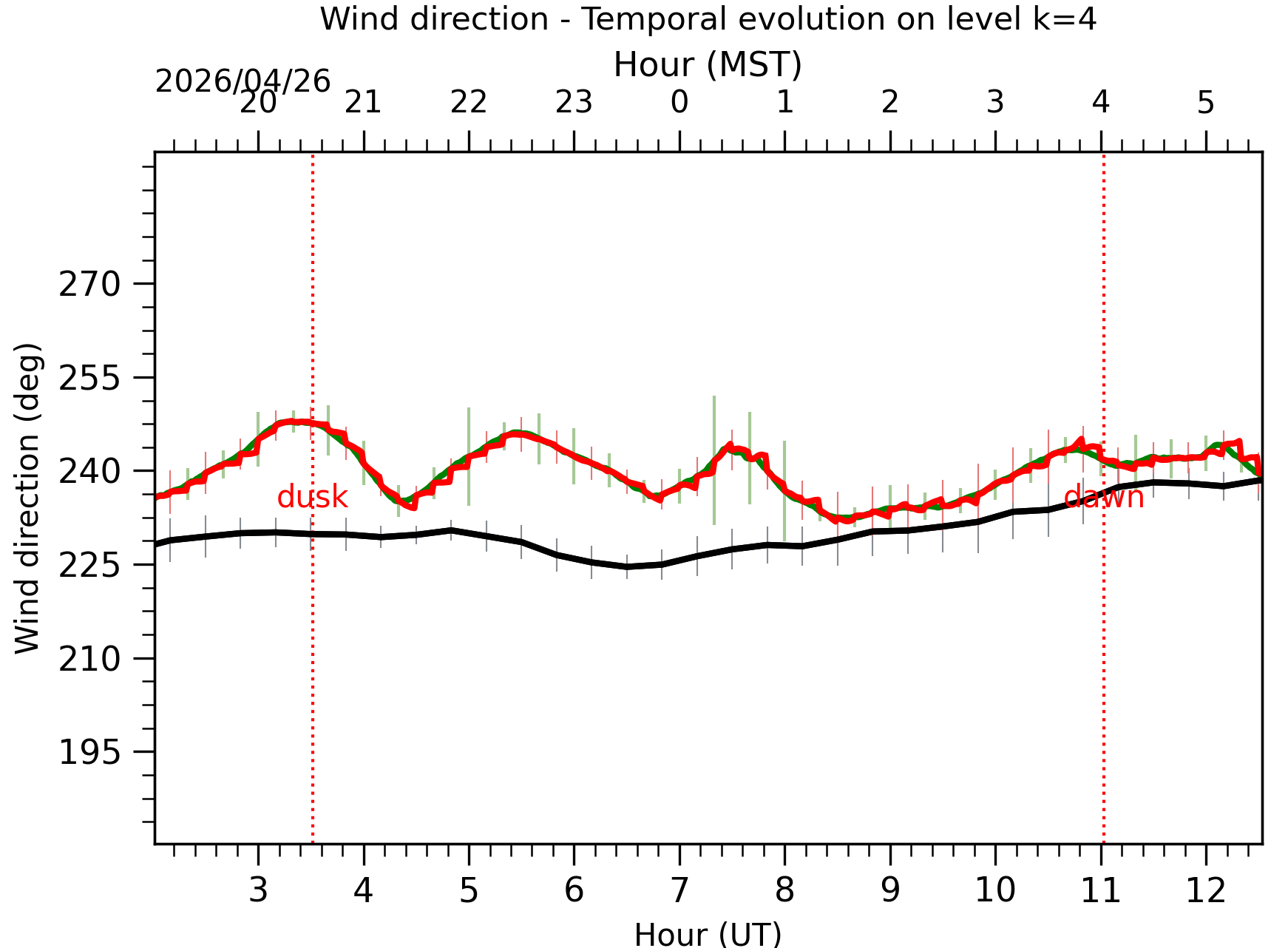 Fig. 8: Averaged wind speed in the three successive periods of the night (see red, blue and green intervals). |