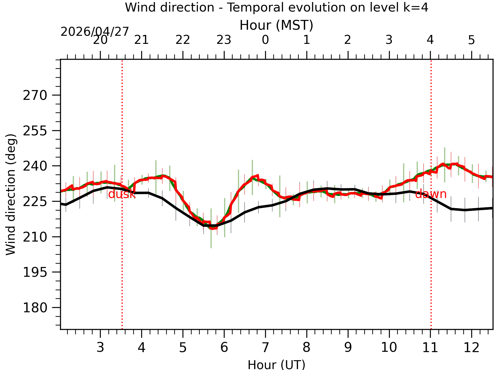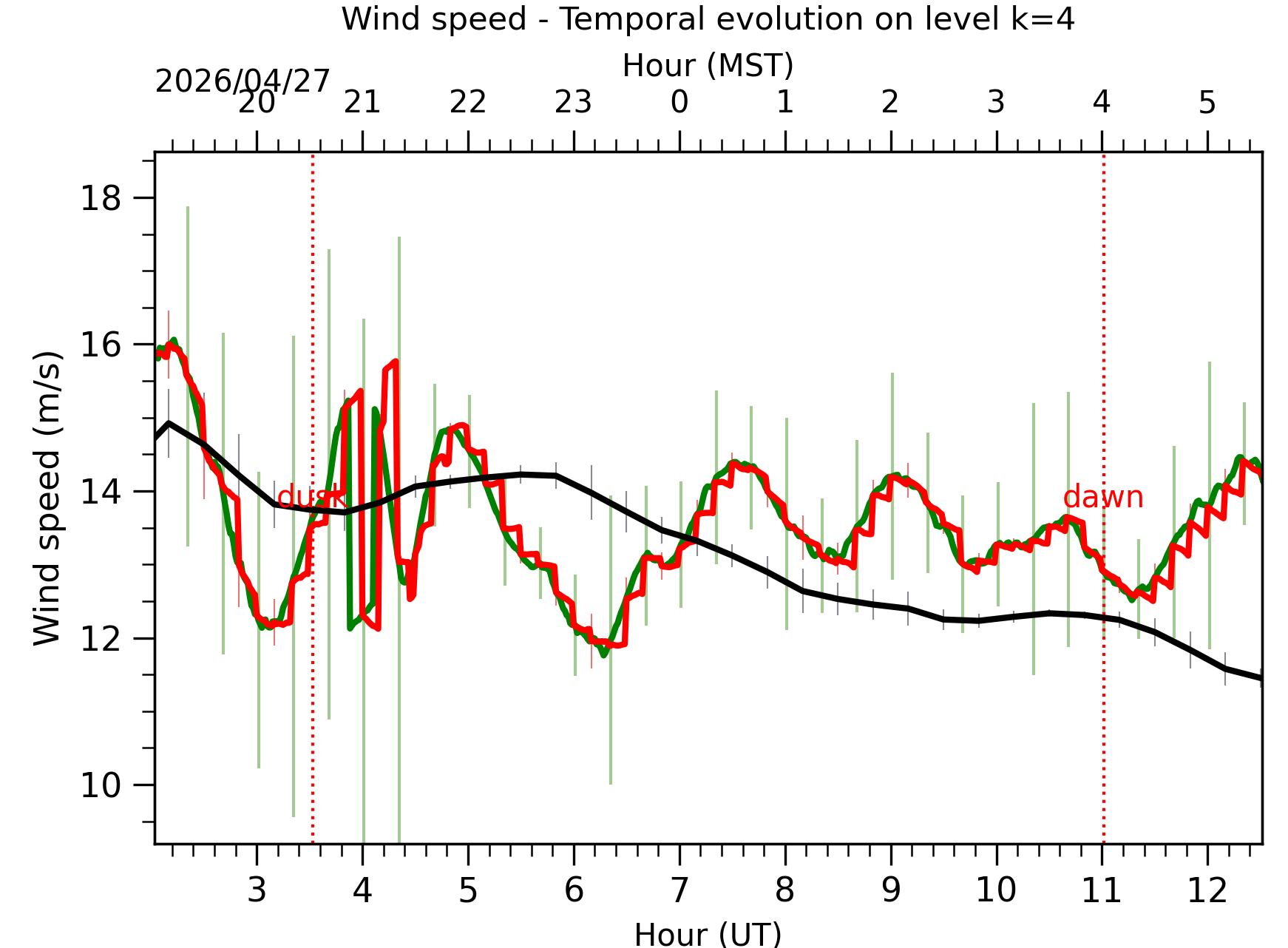 Fig. 8: Averaged wind speed in the three successive periods of the night (see red, blue and green intervals). |