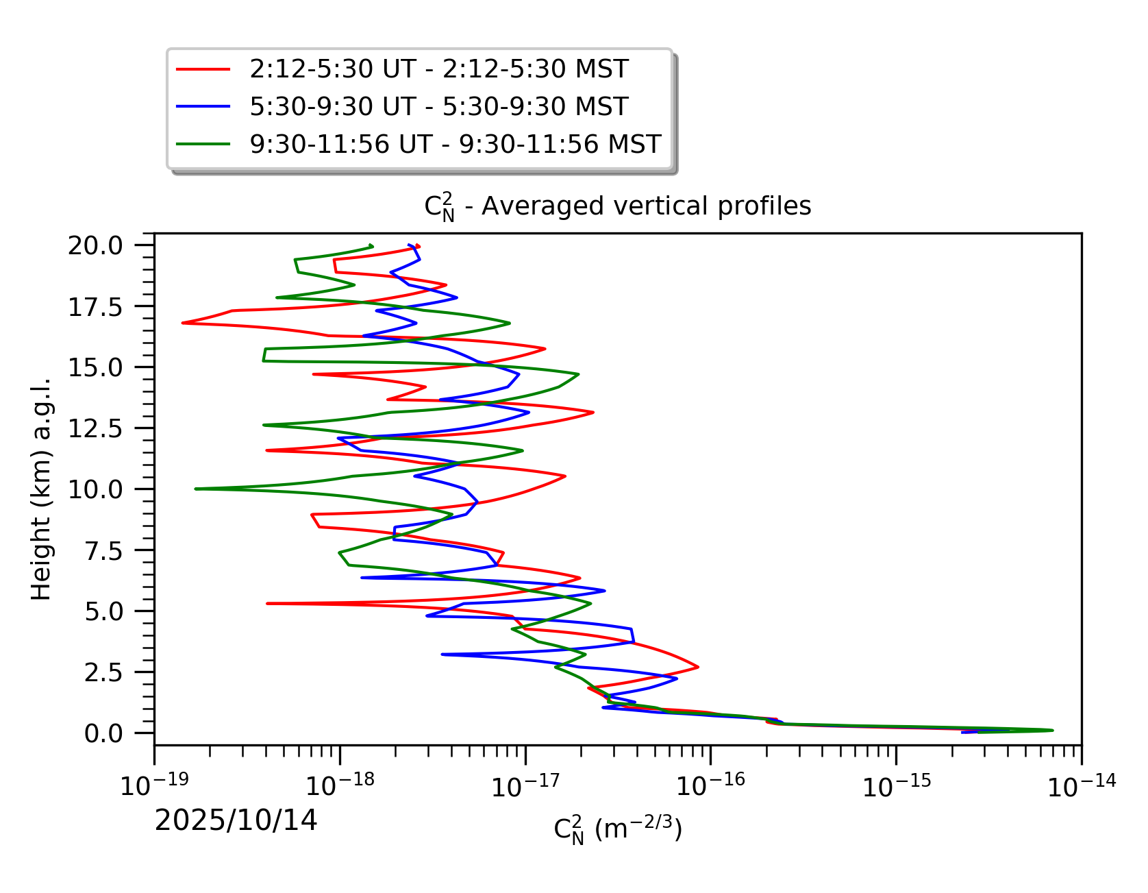Three time averages of the CN2 profiles are presented in Fig. 3 to 5, computed in the first, central and last part of the night (see partition). The corresponding MST (MST=UT-7) is shown on the top of the figure. The blue light halo around each average represents the +/- sigma in the respective time window.