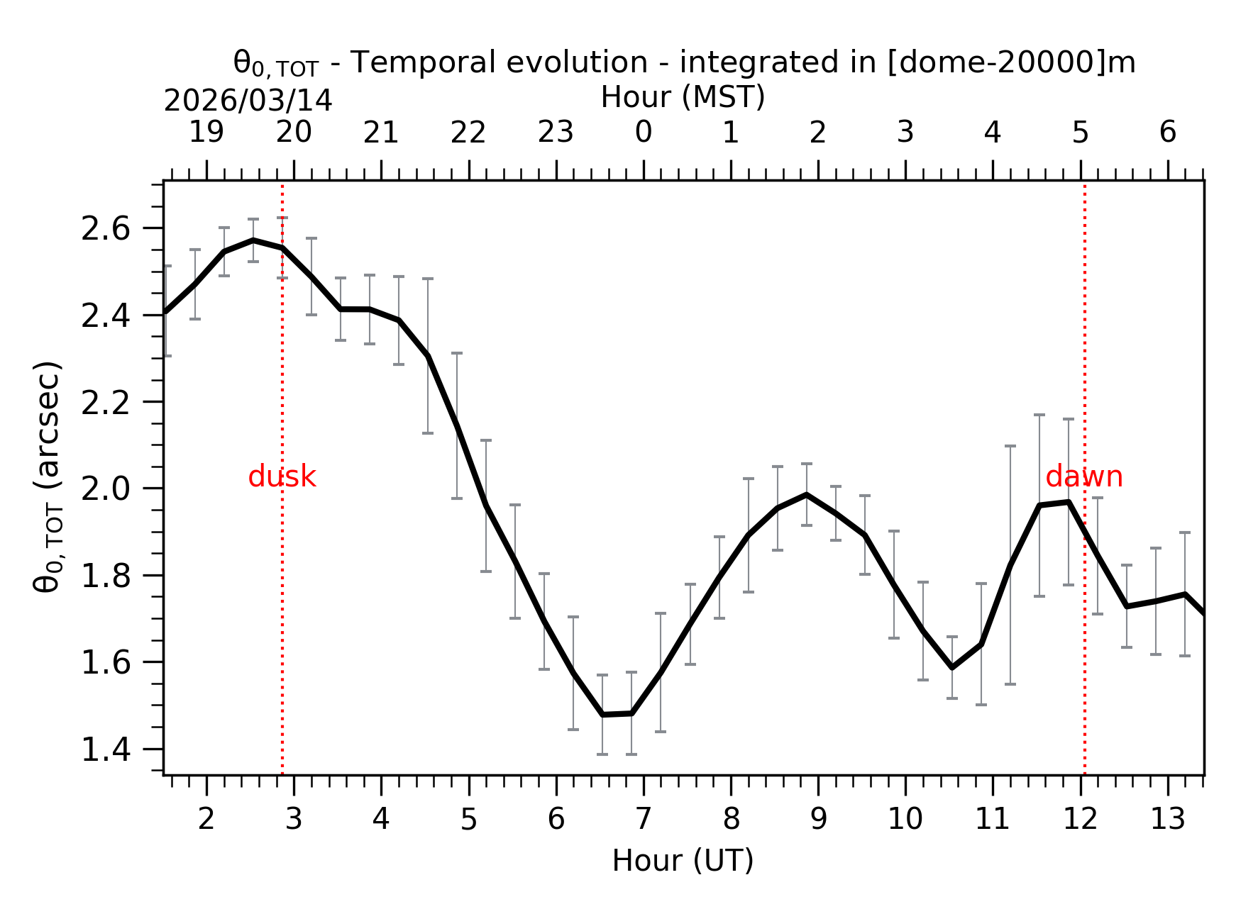 Fig. 1: Temporal evolution of θ0,TOT ([dome-20km]) between the sunset and the sunrise. |