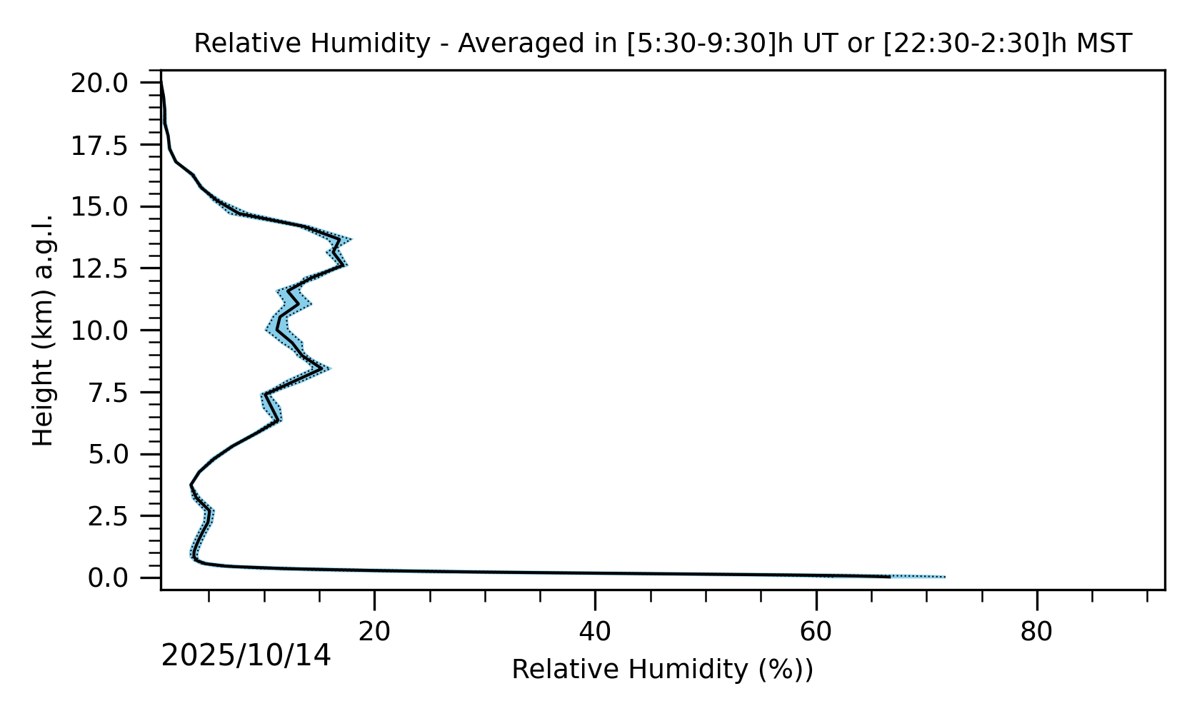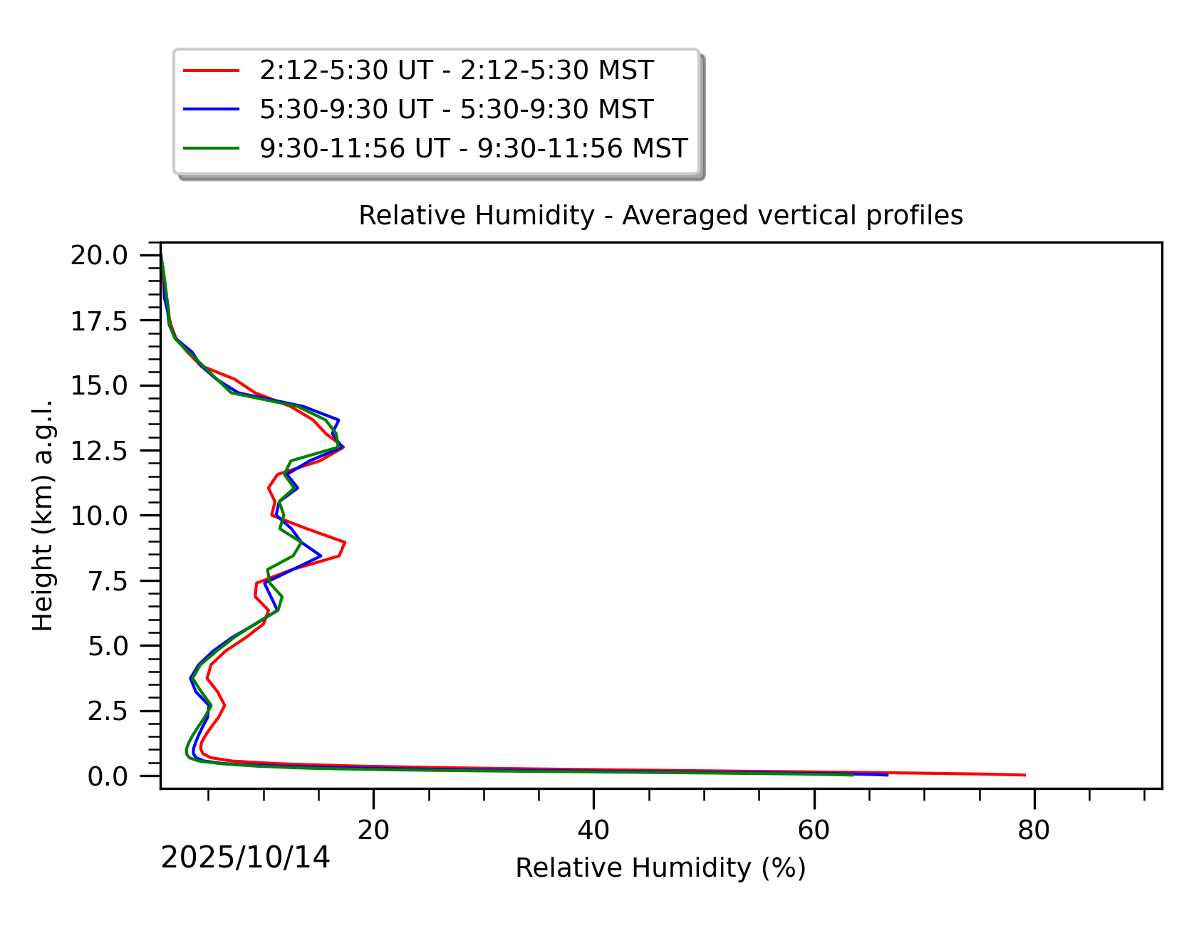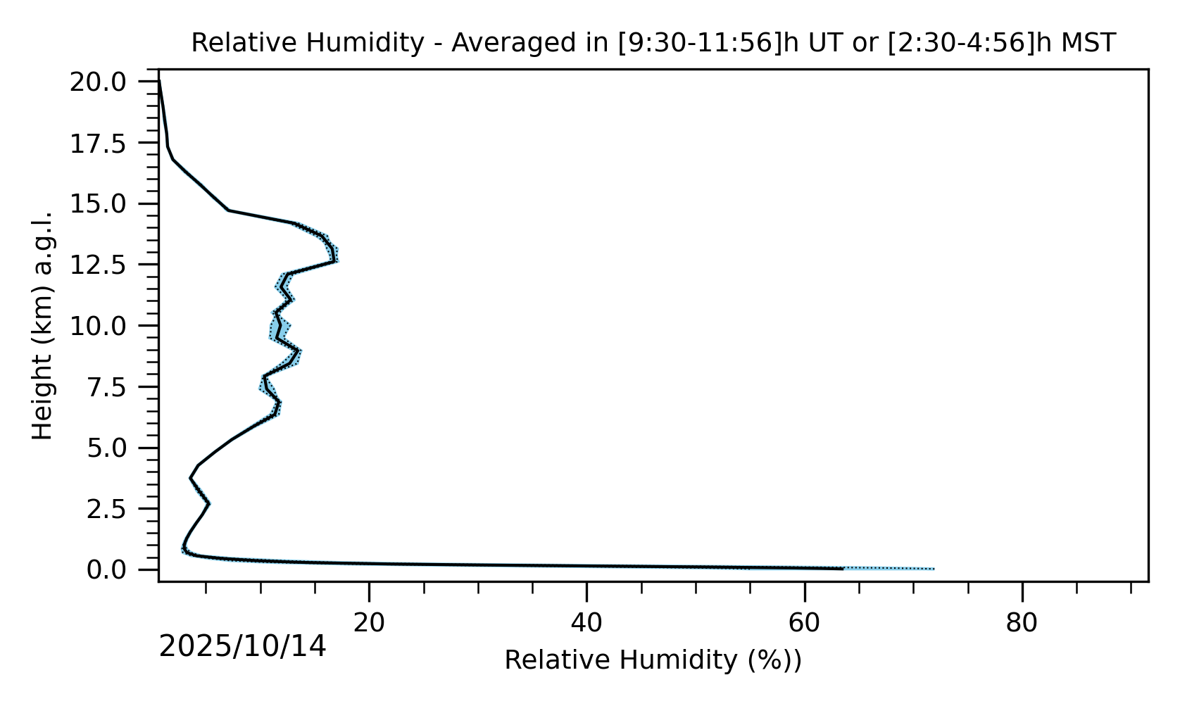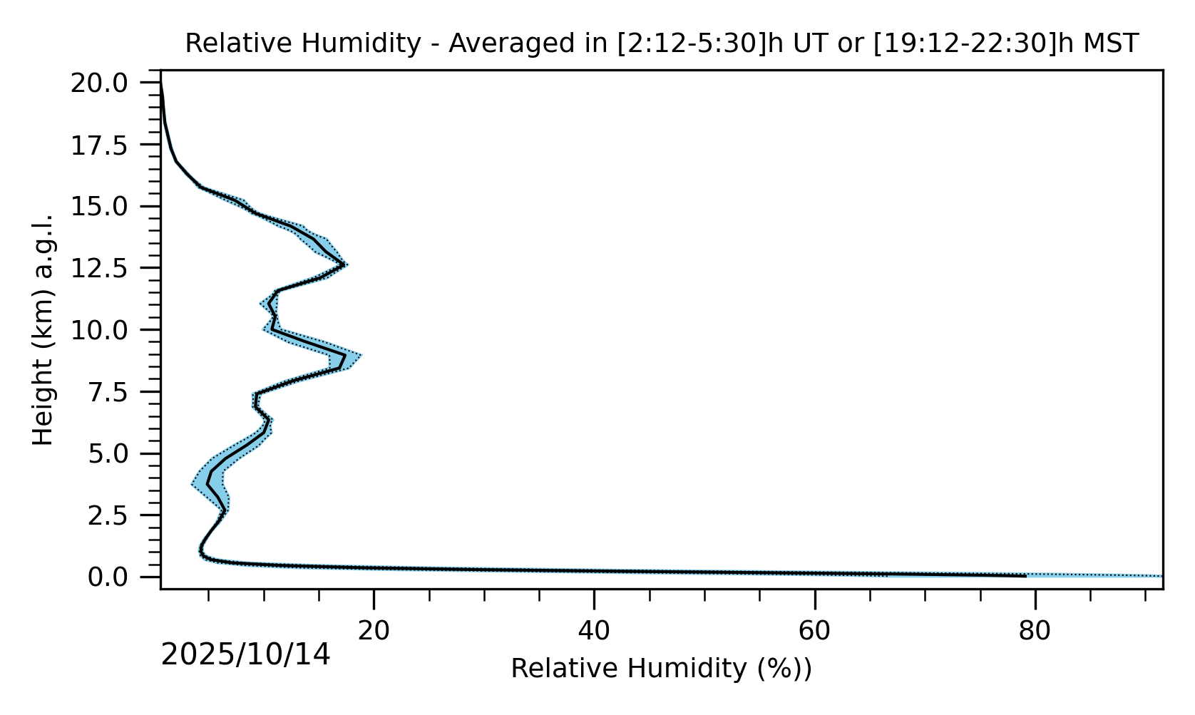 Vertical profiles of the relative humidity are computed in the [0-20km] range above ground level (a.g.l.) and centered on the LBT. Data points frequency is 2 minutes.- TEMPORAL EVOLUTION:
