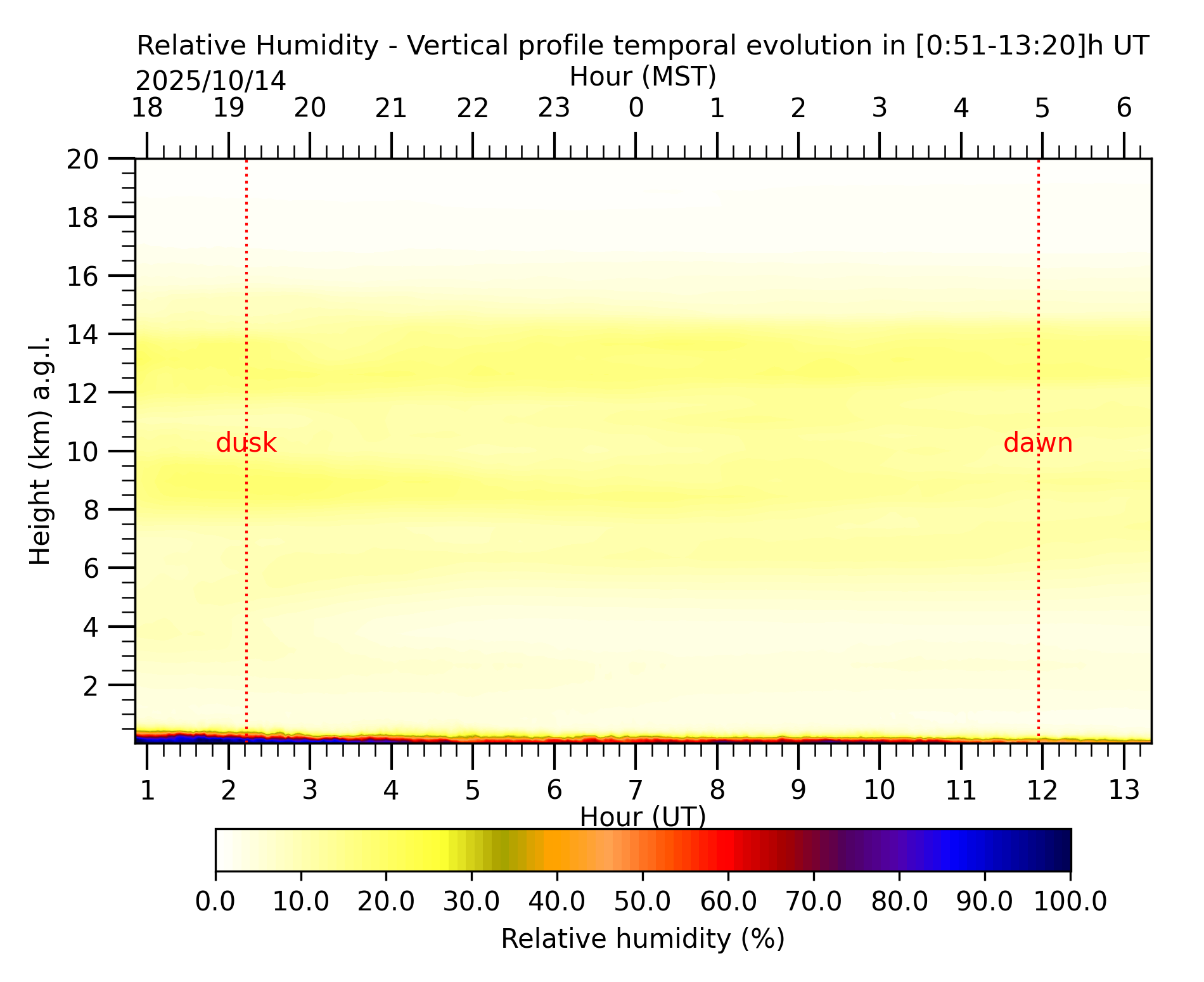 The contour plot represents the temporal evolution of relative humidity vertical profiles between the sunset and the sunrise. On the x-axis is time in UT (bottom), in MST (top). Mountain Standard Time MST=UT-7. On the y-axis the height above ground level. The color scale represents the relative humidity percentage.