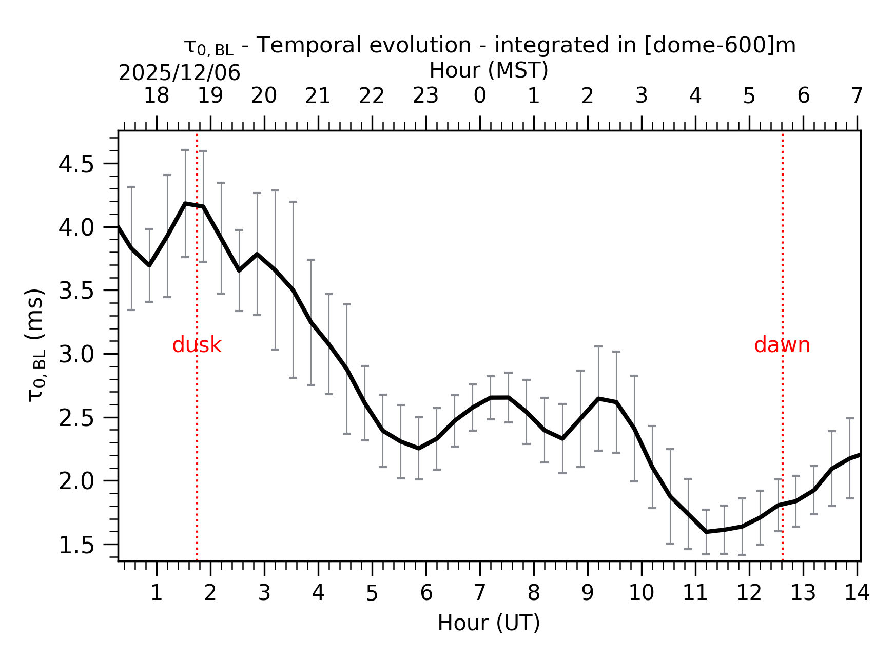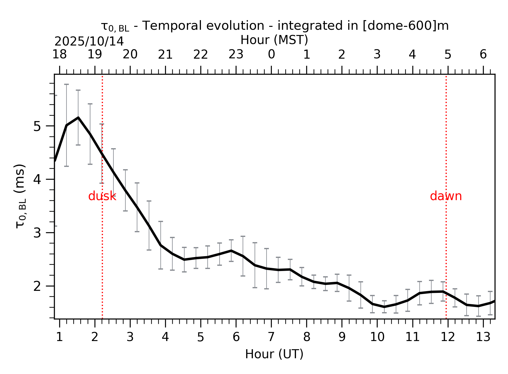 Fig. 2: Temporal evolution of τ0,BL ([dome-600m]) between the sunset and the sunrise. |